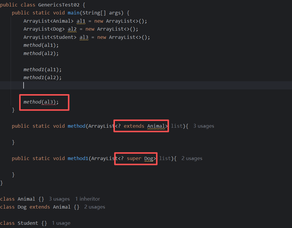 但是我们通常希望,尽可能传递Animal类及其子类,此时就引出了泛型的通配符: