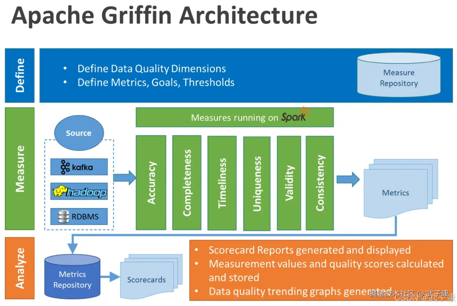 - Define:主要负责定义数据质量统计的维度,比如数据质量统计的时间跨度、统计的目标(源端和目标端数据量是否一致,数据源里某一字段的非空数量、不重复值的数量、最大值、最小值、TOP5的值数量等等)