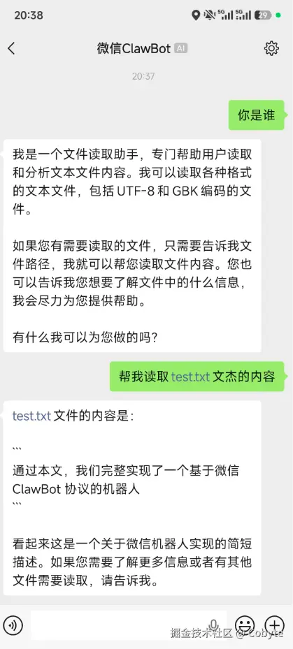 然后在微信 ClawBot 中输入:帮我读取 test.txt 的文件内容,显示如下