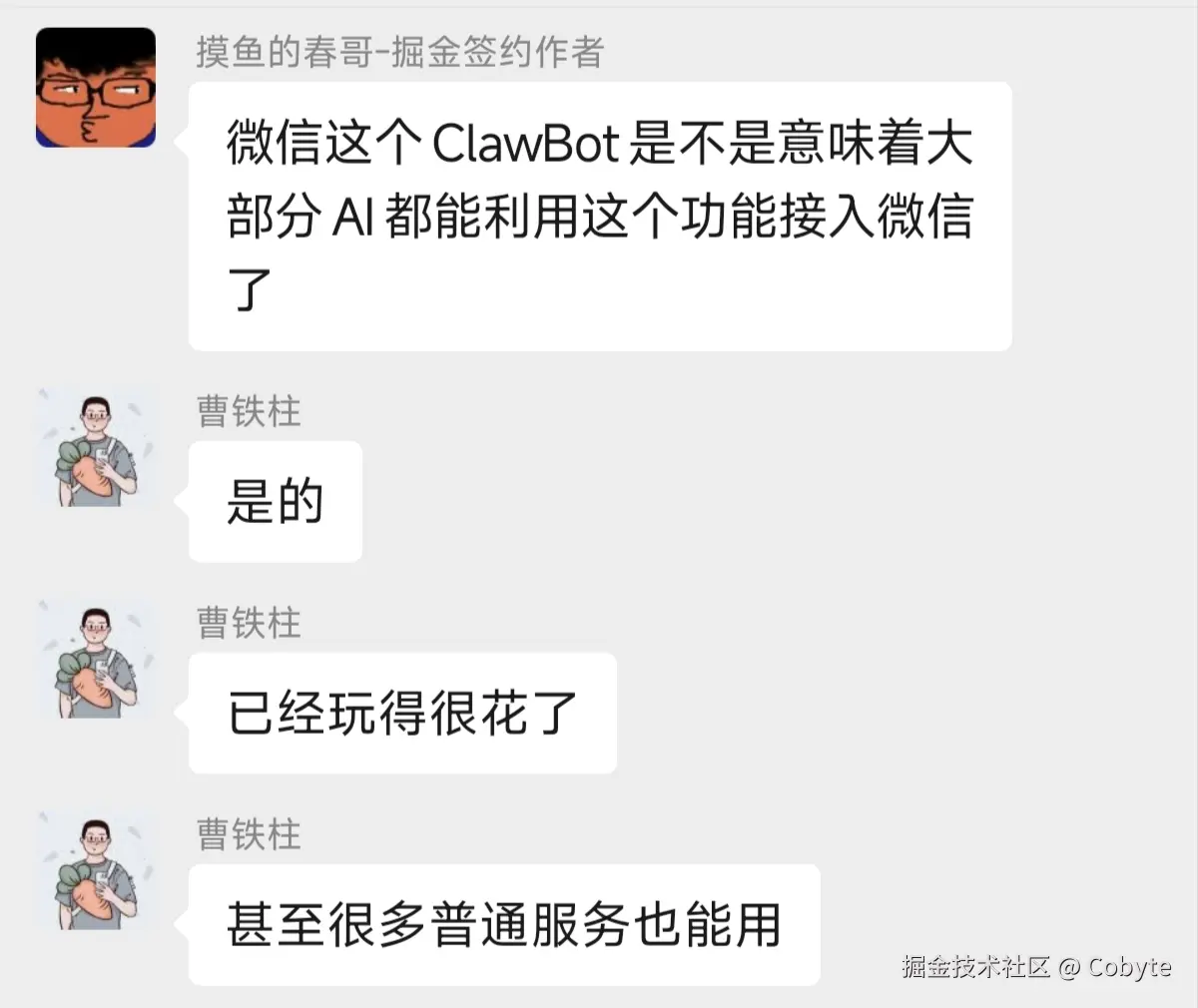 我们知道微信最近推出了微信 ClawBot,用于在微信中与 OpenClaw 收发消息。掘金签约作者群里的一位大佬说: