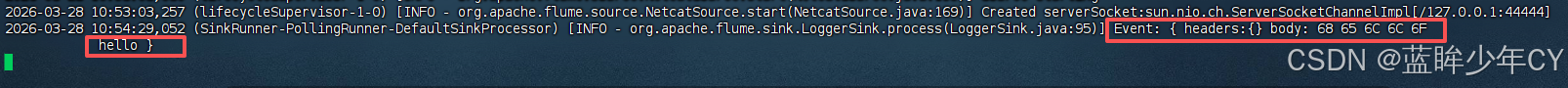 - --conf-file/-f:flume 本次启动读取的配置文件是在job文件夹下的flume-netcat-logger.conf文件。 -Dflume.root.logger=INFO,console:-D 表示flume运行时动态修改 flume.root.logger参数属性值,并将控制台日志打印级别设置为INFO级别。日志级别包括:log、info、warn、error
