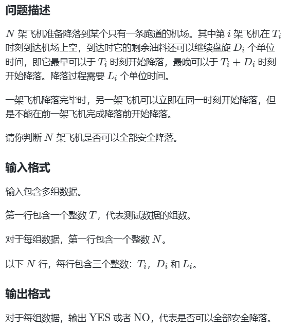 DFS板子题,唯一需要注意的点在于当前飞机的最早降落时间是取上一架飞机的降落时间和当前飞机的到达时间的最大值,即 t 当前飞机开始降落时间 = m a x ( t 上一架飞机完全降落 , t 当前飞机到达机场 ) t_{当前飞机开始降落时间}=max(t_{上一架飞机完全降落},t_{当前飞机到达机场}) t当前飞机开始降落时间=max(t上一架飞机完全降落,t当前飞机到达机场)。