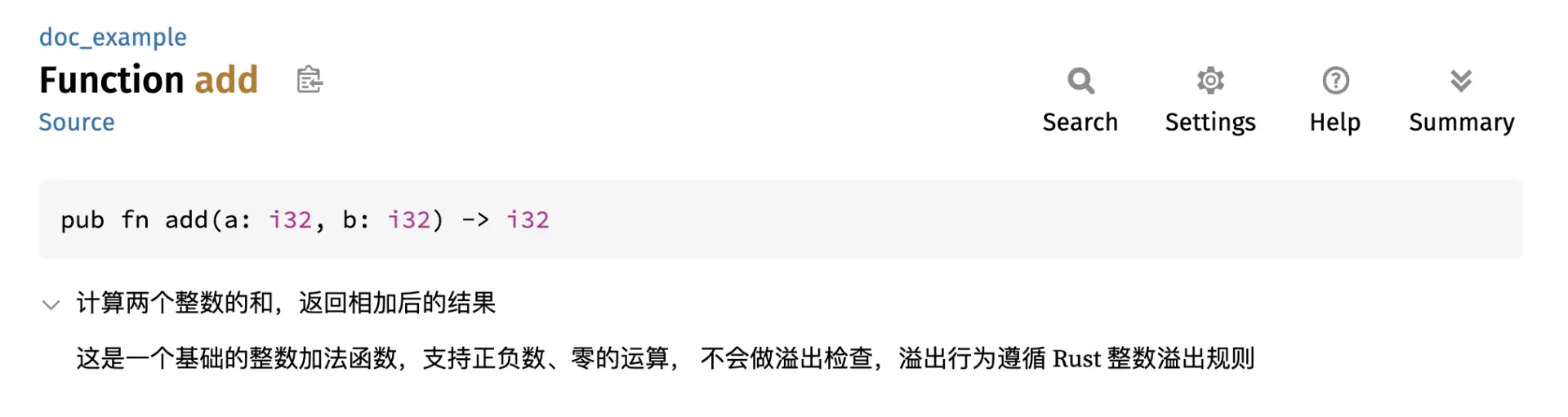 执行 cargo doc --open,你就能在文档中看到这个函数的完整说明,rustdoc 会自动把注释内容渲染到函数的详情页中。