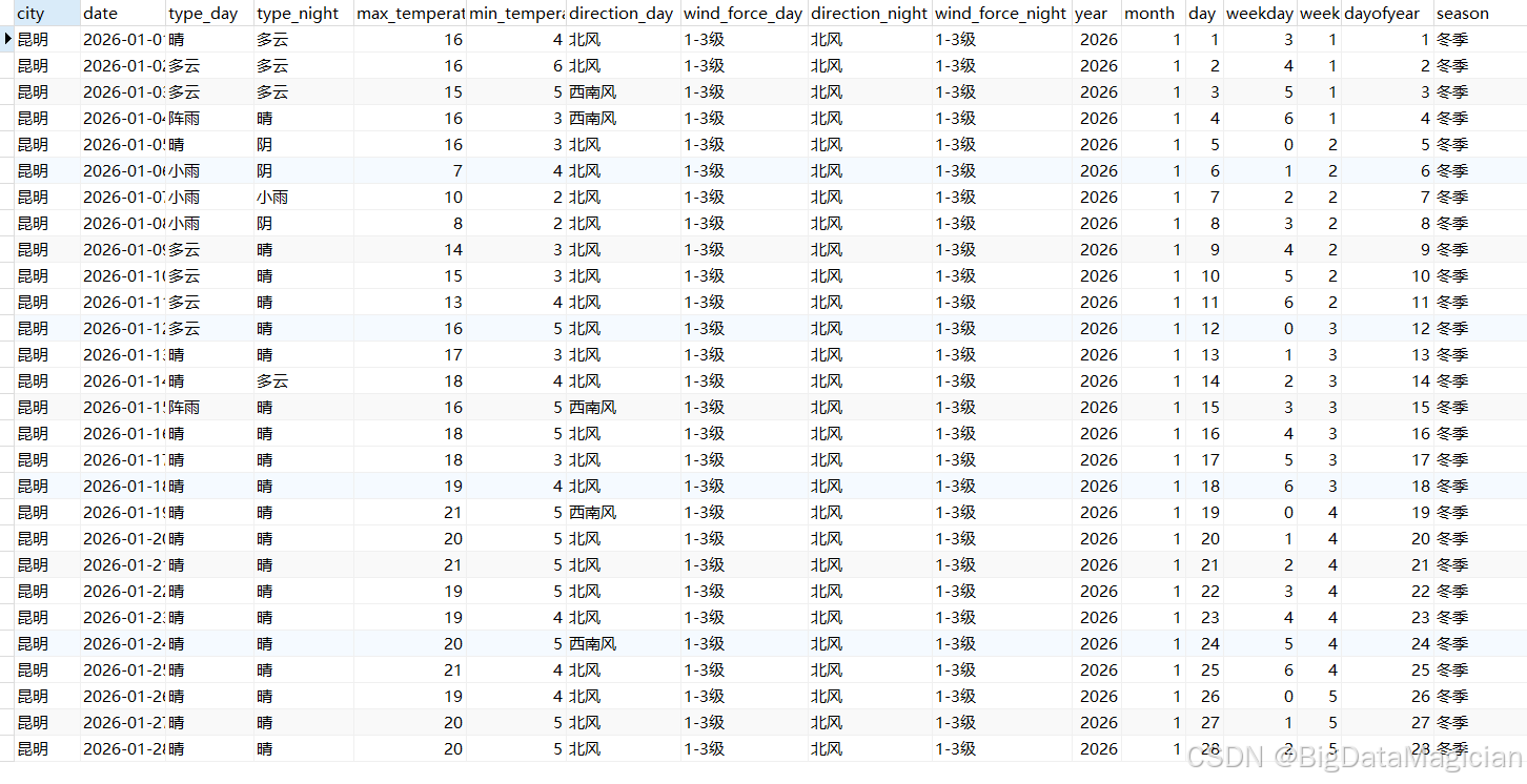 持久化保存后的数据如下图所示,经完整预处理流程后,云南省各城市天气数据已实现规范化与结构化。从持久化保存的结果表可见,数据包含原始天气特征与新增时间维度特征共17个字段,其中城市、日期、标准化后的昼夜天气类型与风力等级、清洗后的温度数据格式统一、无缺失与冗余;新增的年、月、日、星期、周数、年内天数及季节等时间特征,为后续气象时序分析、季节气候规律挖掘提供了丰富维度。整体数据干净规范、结构完整,可直接用于可视化、建模分析等后续工作,充分体现了预处理脚本的有效性与实用价值。