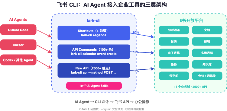 第一层 Shortcuts 是给懒人和 AI 用的------+agenda 直接列今天的日程,不用管背后调了哪个 API、传了什么参数。第二层是 API 的命令行映射,和飞书开放平台文档一一对应。第三层是逃生舱,2500 个 API 任你调,想干什么都行。