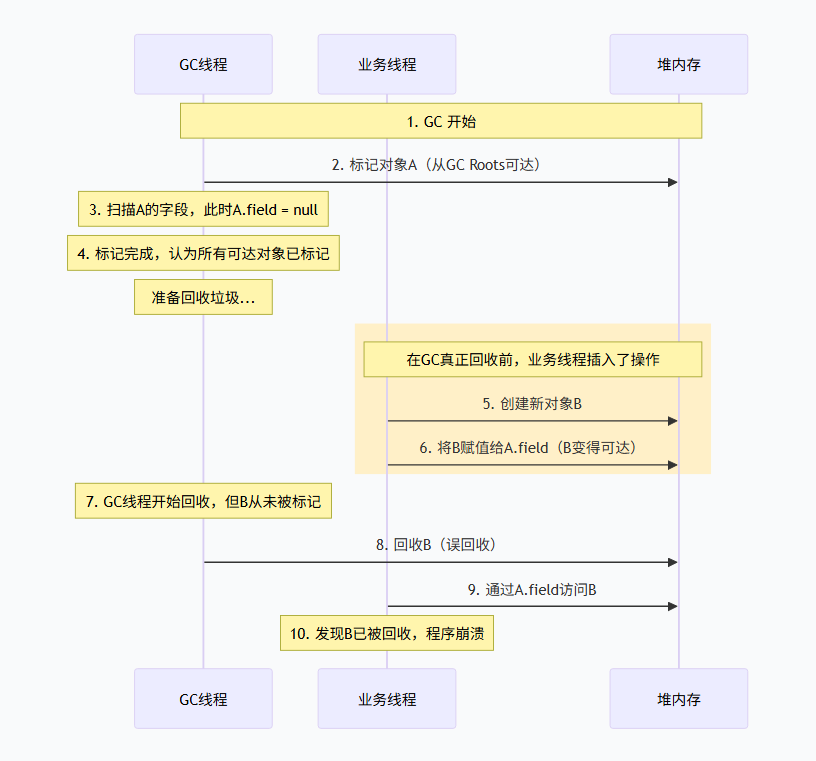 - 为什么需要 STW:可达性分析需要对象引用关系在一瞬间静止,否则业务线程修改引用会导致标记结果错误,可能误回收正在使用的对象(致命错误)。