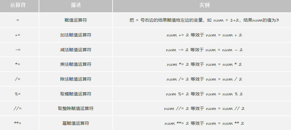 (2)赋值运算符:是编程语言中用于将值(或表达式的结果)保存到变量中的运算符。(把右边的值,赋给左边的变量)