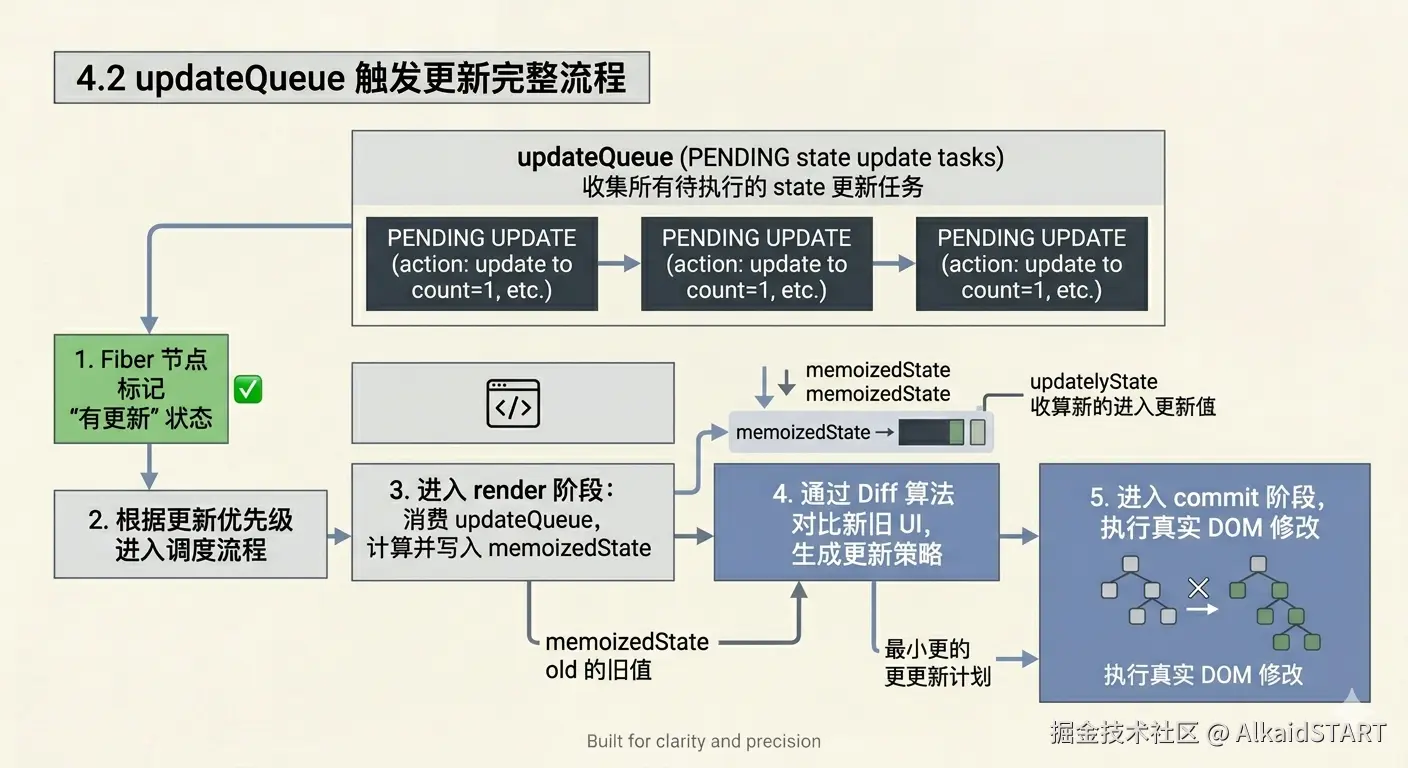 - 调度开始后进入 render 阶段:遍历 Fiber 树,从 updateQueue 取出更新,计算出最终新 state,保存到 memoizedState。