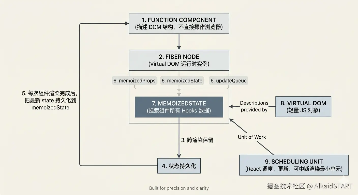 - React 取 Hooks 状态,靠的是 Fiber 上那条 按顺序排好的 Hook 链表。