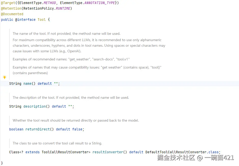 在 Spring AI 中,所有工具的本质都是 ToolCallback 接口。上面已经说了定义工具的两种方式,ToolCallbak其实是第三种,我们可以实现ToolCallback接口来完全控制 schema 和执行逻辑 。