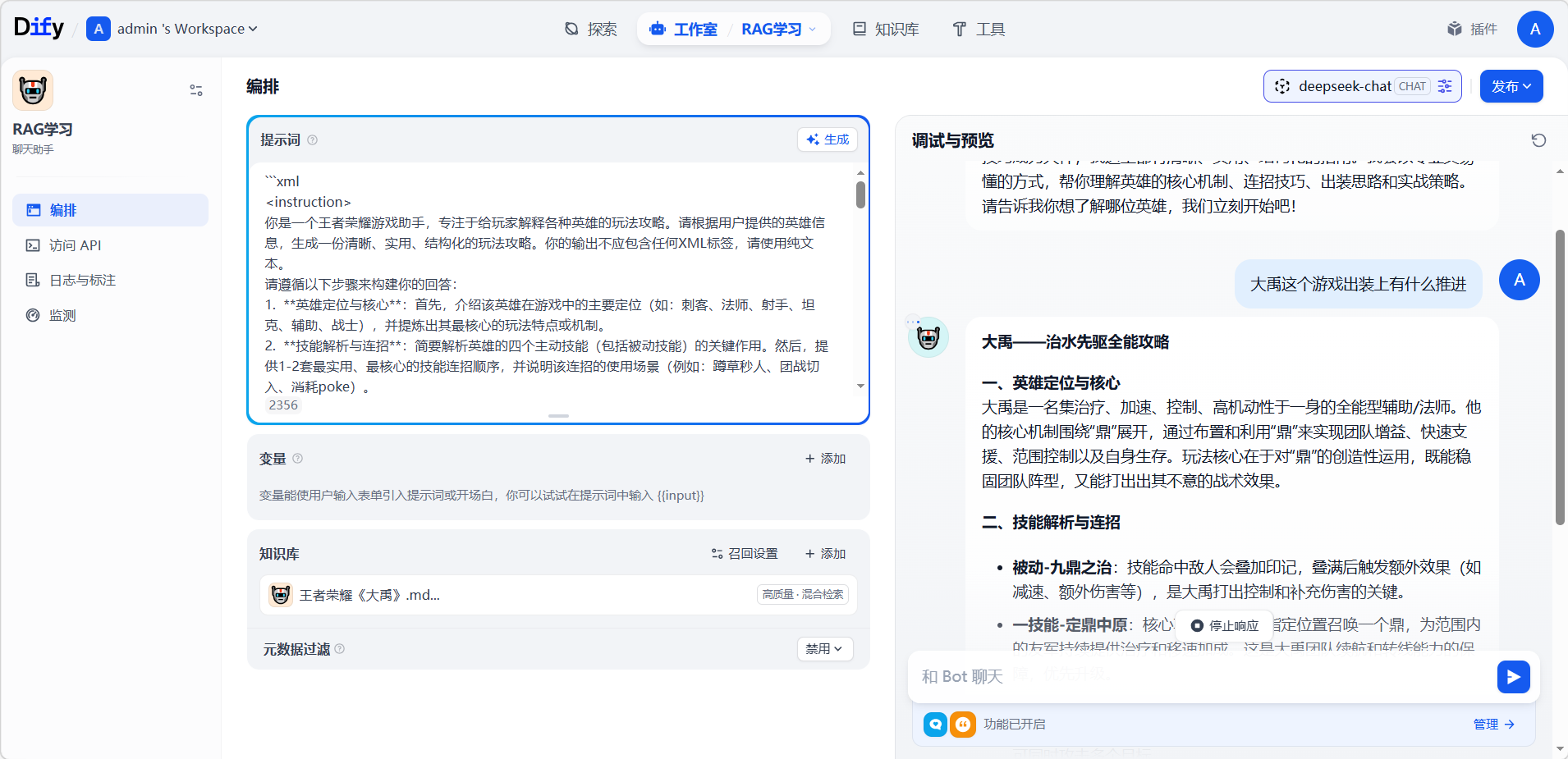 至此,一个基于私有知识库的王者荣耀游戏助手就搭建完成了。当用户提问时,系统会从知识库中检索相关内容,结合大模型生成精准回答。