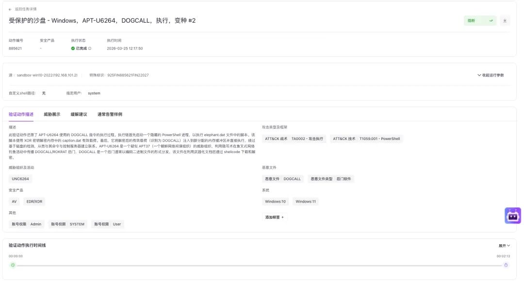 以下是还原的关键执行序列(验证规则:受保护的沙盘 - Windows,APT-U6264,DOGCALL,执行,变种 #2):