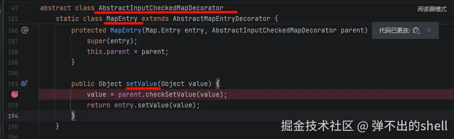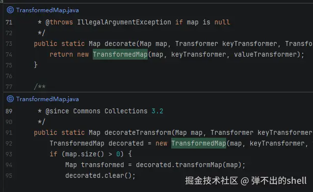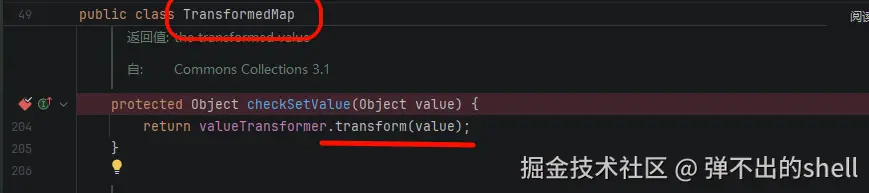TransformedMap ------当 Map 的值被修改时,会自动调用 valueTransformer.transform()。不过它是 protected 类型,不能直接使用,需要找到调用这个方法的入口。