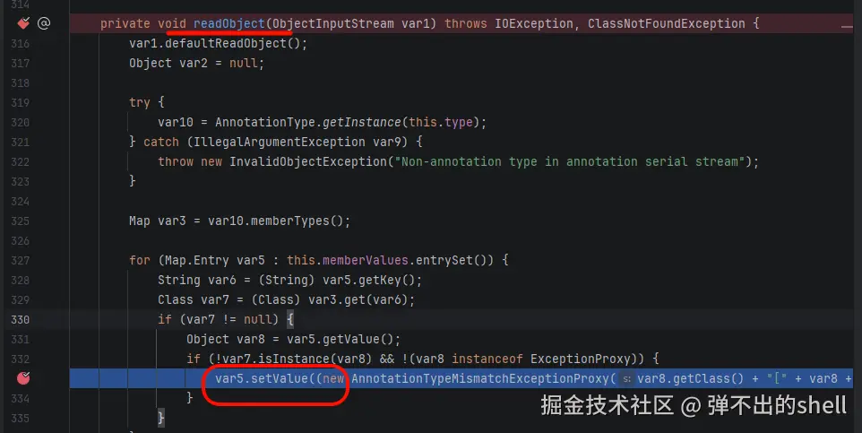最终找到的是 AnnotationInvocationHandler.class 里的 readObject 方法------这就是我们想要的终点,readObject 会被反序列化自动调用,setValue 在其 for 循环里: