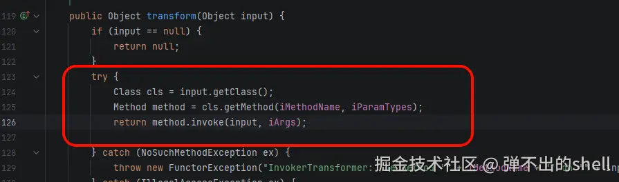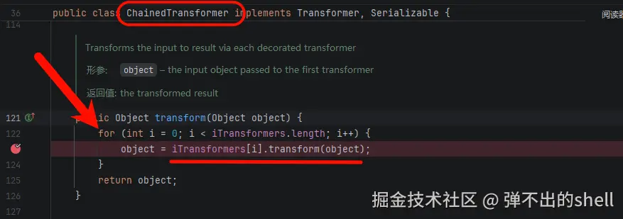 ChainedTransformer.transform() ------它把每个 Transformer 串起来,上一个的输出自动传给下一个。这刚好弥补了需要多次调用 InvokerTransformer.transform() 才能实现完整反序列化链的问题。