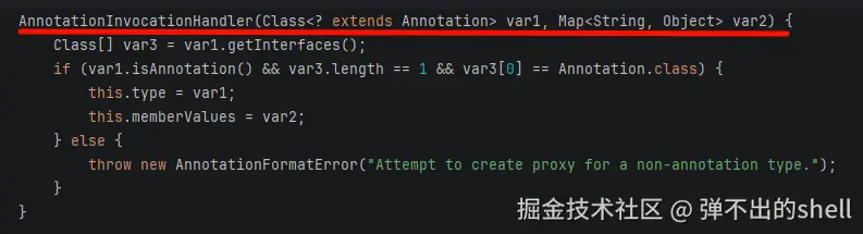 先找到 AnnotationInvocationHandler 的构造方法,看它需要什么参数: