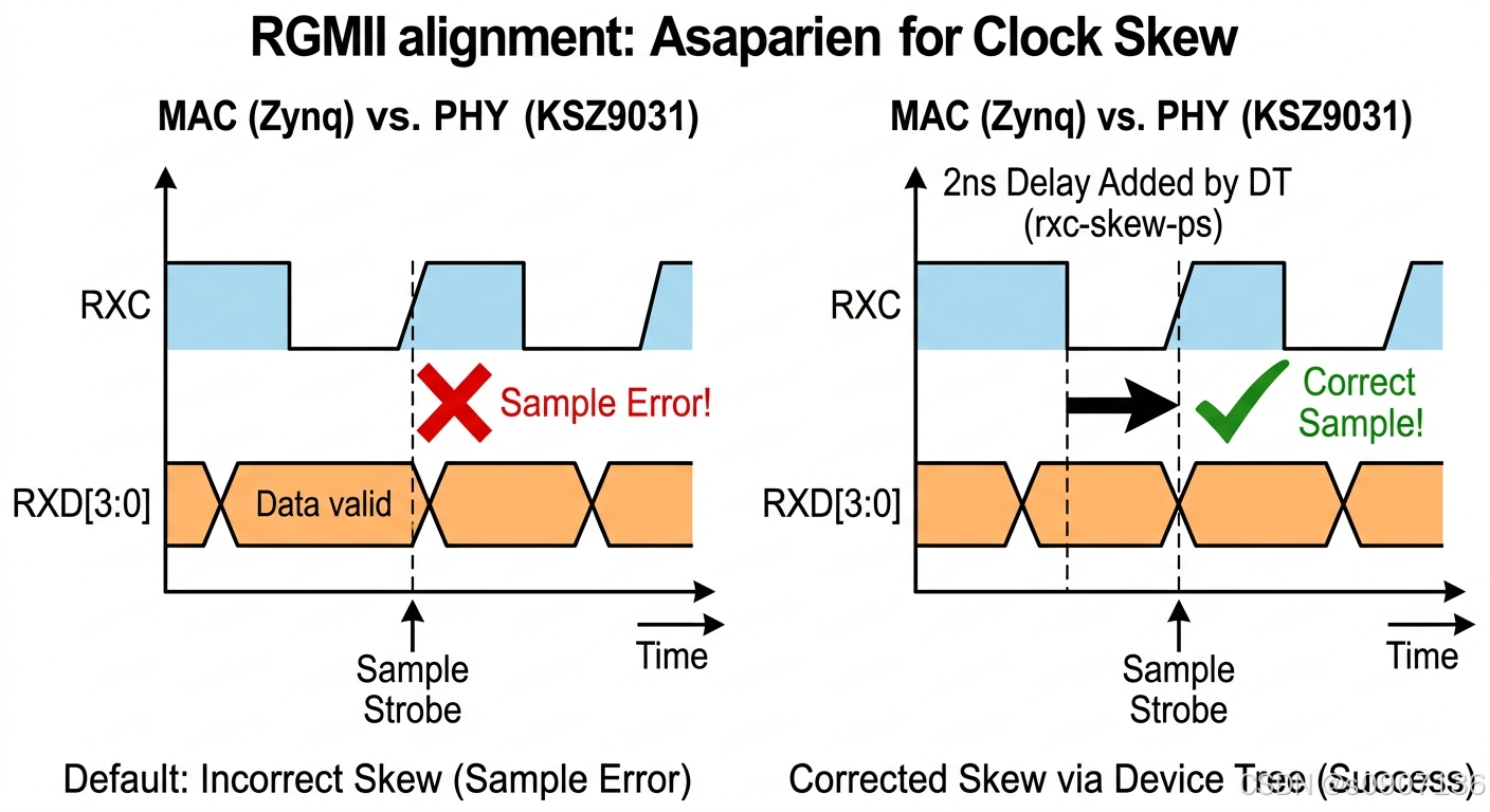 由于不同自制板卡的 PCB 走线长度不同,默认的 2.0ns 可能不够。而 Micrel KSZ9031 的 Linux 驱动支持通过设备树读取 txc-skew-ps = <3000> 等参数,直接写入其底层内部寄存器,从而实现皮秒级的完美时序对齐。这就是为什么上面的几行代码能起到起死回生作用的根本原因。
