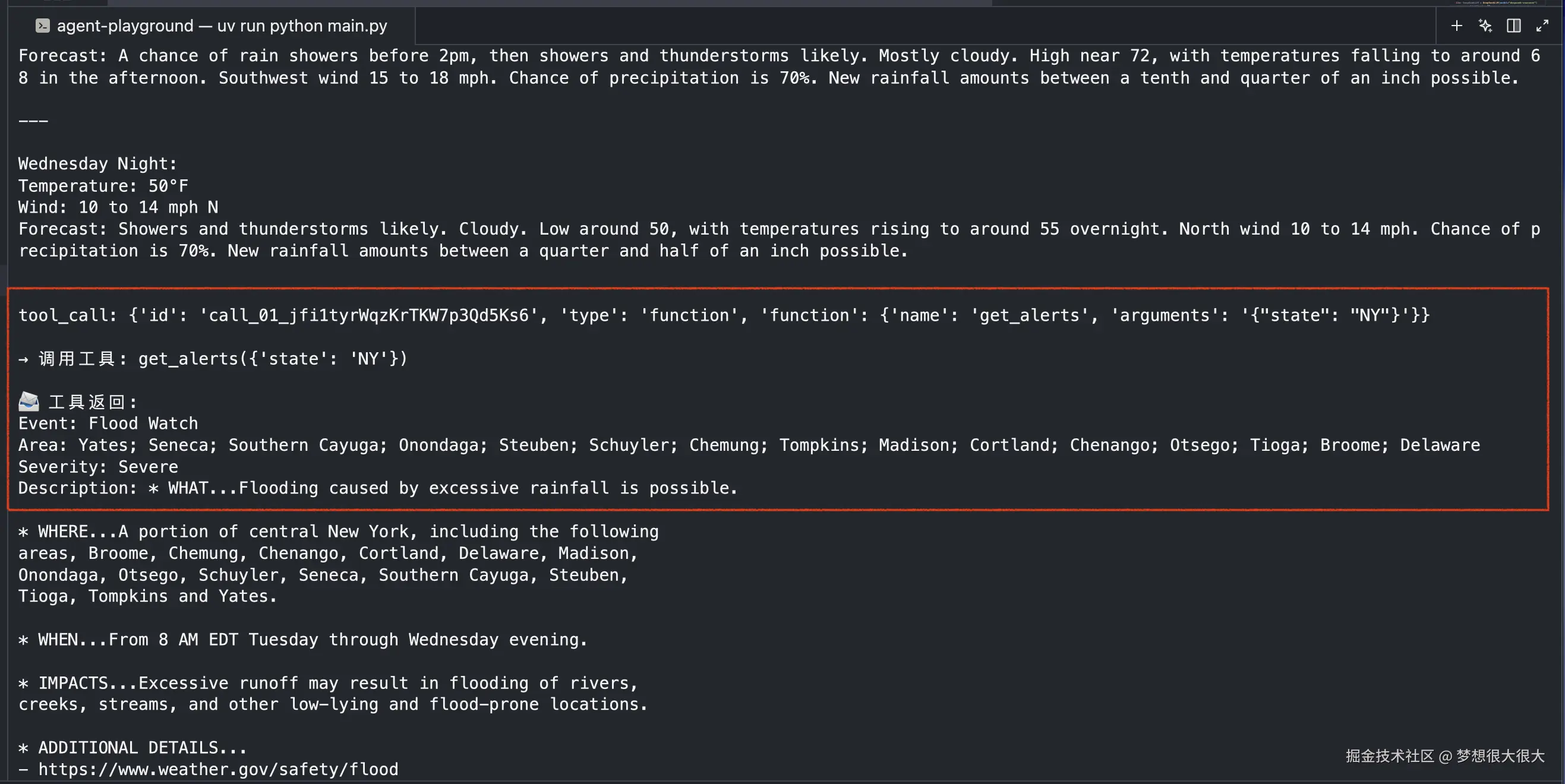 我们再试试另一个问题:明天纽约的天气怎么样,有天气预警吗,看多个工具的调用是否也正常。