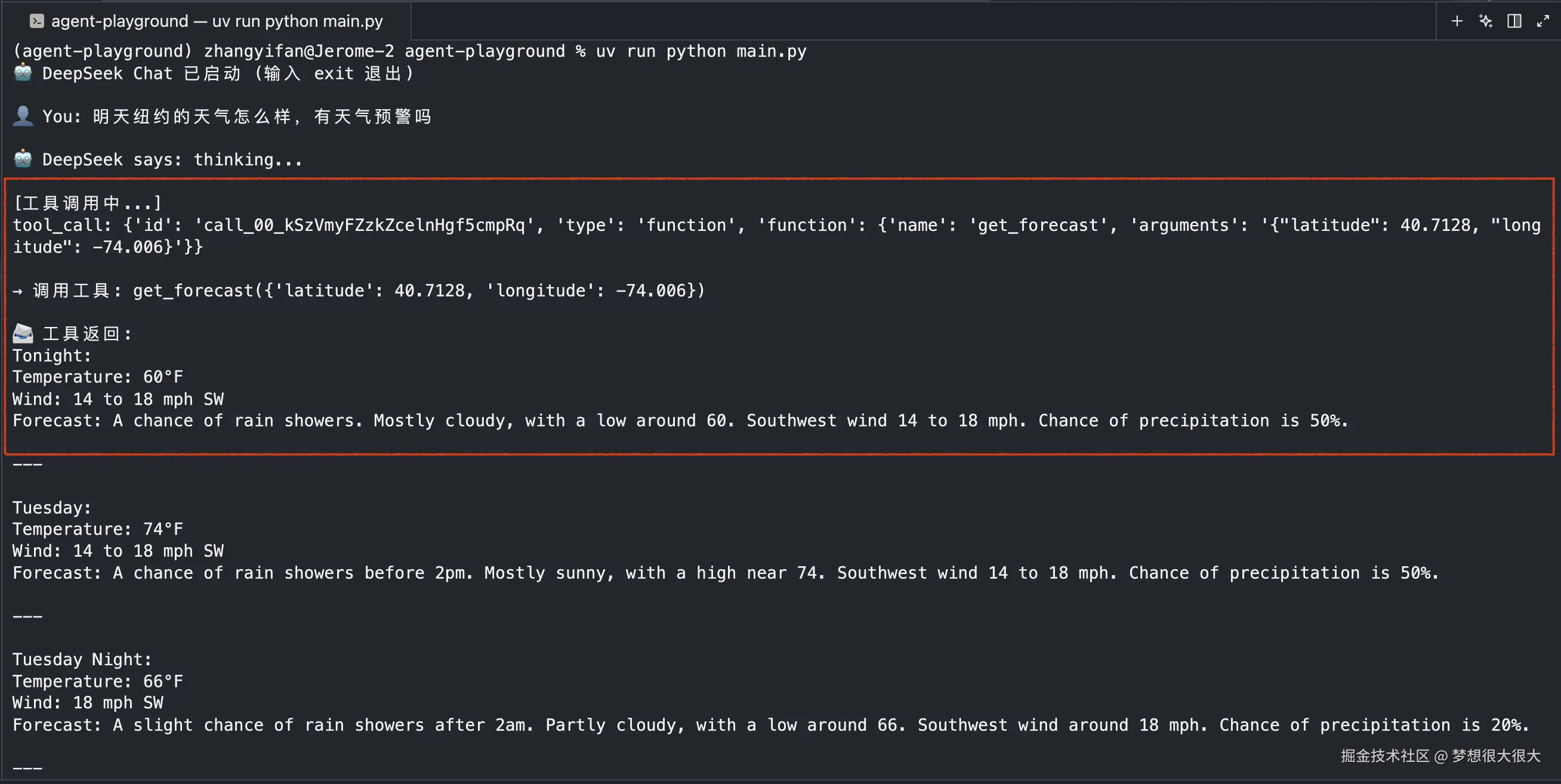 - 🤖 模型看到真实的数据后,用非常自然、拟人的口吻,结合天气情况回答了你的问题。