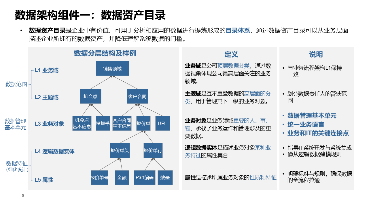 该方案适用于企业数字化转型负责人、数据架构师、IT 运维管理人员及相关咨询从业者。其重要性体现在:聚焦企业数字化转型中数据杂乱、标准缺失、共享困难等痛点,提供 L1-L5 全层级数据架构设计方法论。涵盖数据资产目录、数据标准、数据模型、数据分布四大核心组件,搭配清晰规划步骤与实操案例,可帮助企业厘清数据资产、统一数据语言、打通数据流转链路。方案能支撑数据共享与业务协同,夯实数字化转型的数据底座,提升数据质量与应用价值,为企业决策优化、效率提升提供坚实数据支撑。