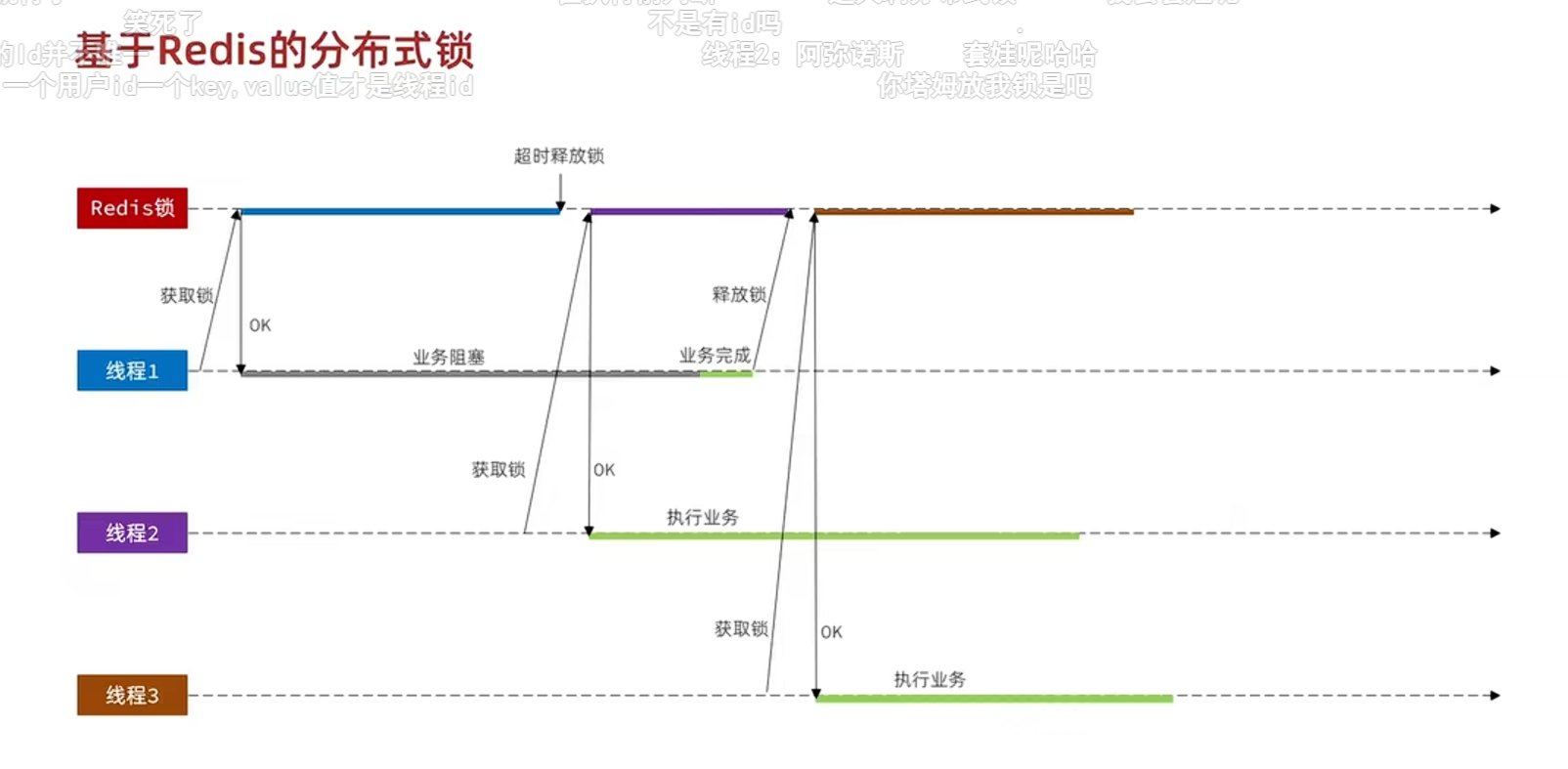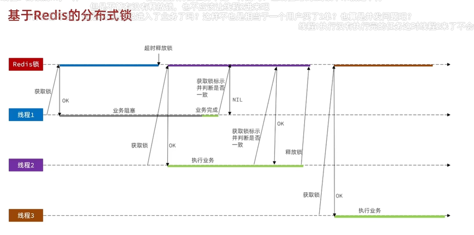 JVM垃圾回收的时候会阻塞所有操作,这会导致此时判断锁是否是自己的线程号成功了,但是还没执行释放锁操作就阻塞了。然后在阻塞过程中TTL到期自动释放,此时线程二申请到了锁。但是在线程二保有锁期间线程1阻塞解除。继续执行释放锁操作来删除redis中的锁。此时就会导致线程2申请到的锁被错误释放