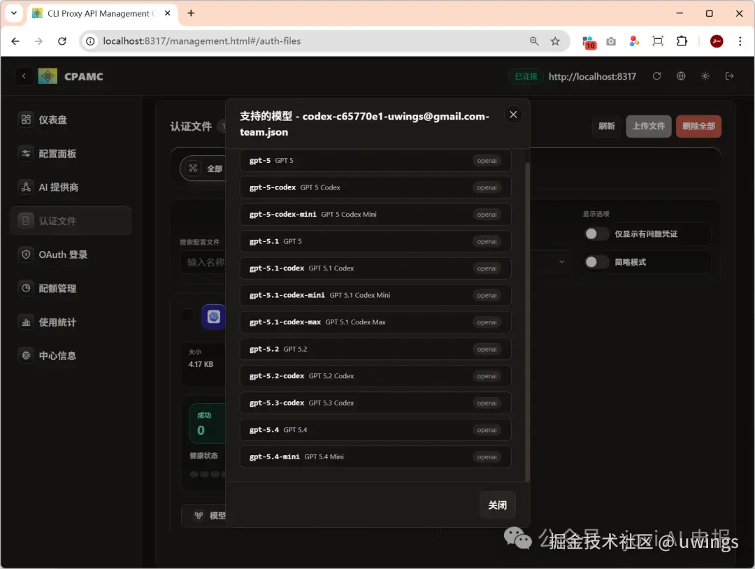 打开:http://localhost:8317/management.html#/auth-files 找到刚才那个认证文件,点"模型",把模型列表打开。