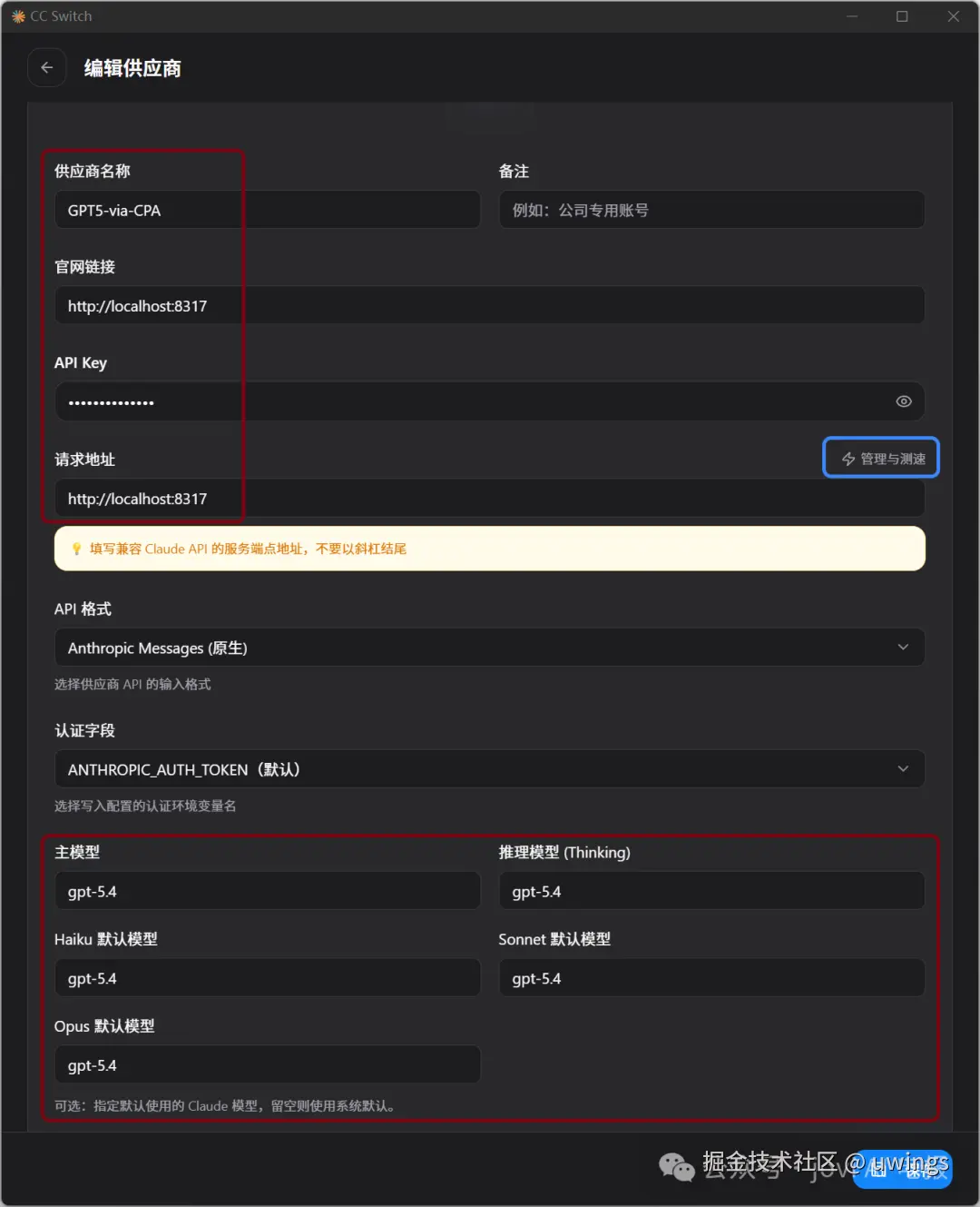在 cc-switch 里新增配置,填下面这些: