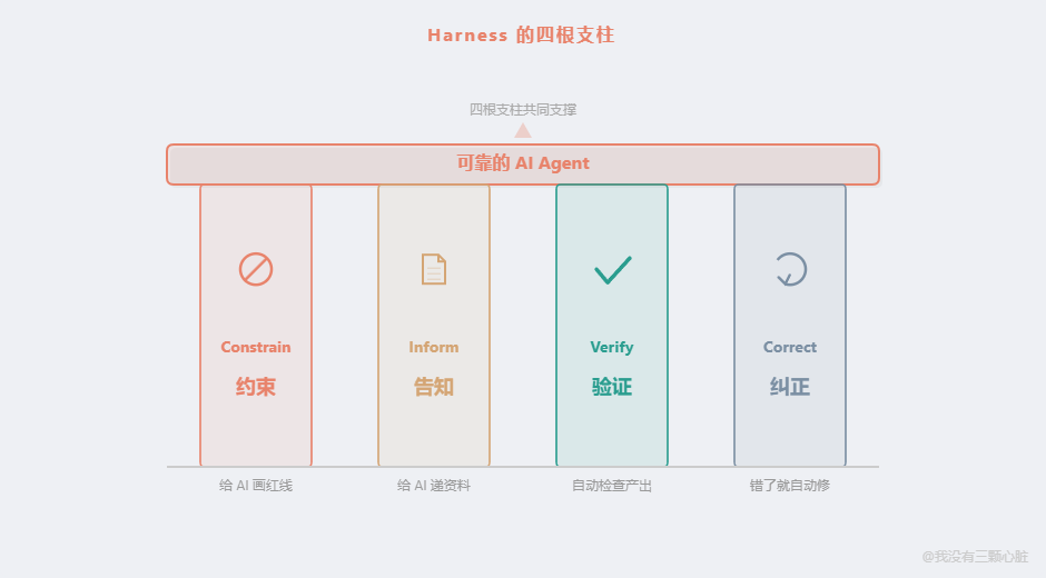 根据 OpenAI Codex 团队的实践和业界的总结,一个 Harness 通常由四根支柱组成: