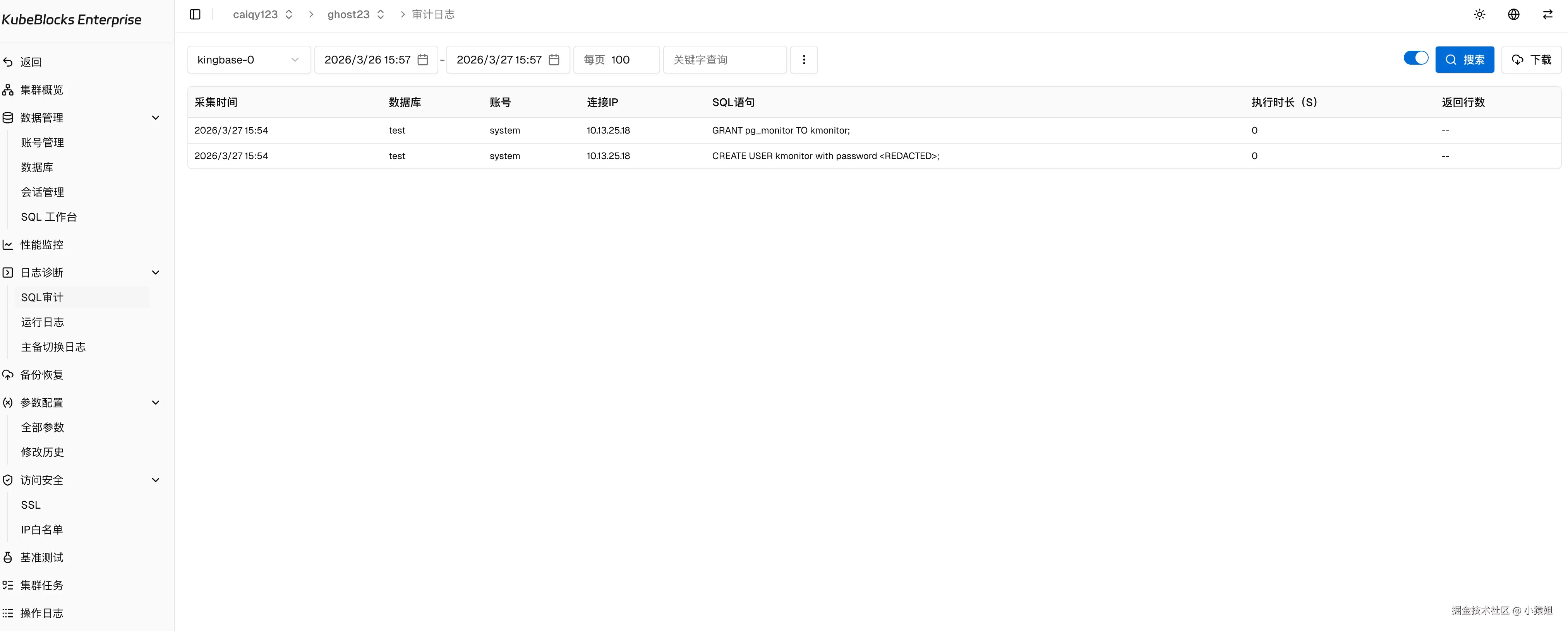 KubeBlocks 企业版集成了 Kingbase 的审计能力,支持对 CREATE、ALTER、DROP、DML、事务等多类数据库操作进行审计。用户也可以控制审计日志开关、审计日志级别等参数,满足不同场景下的审计需求。