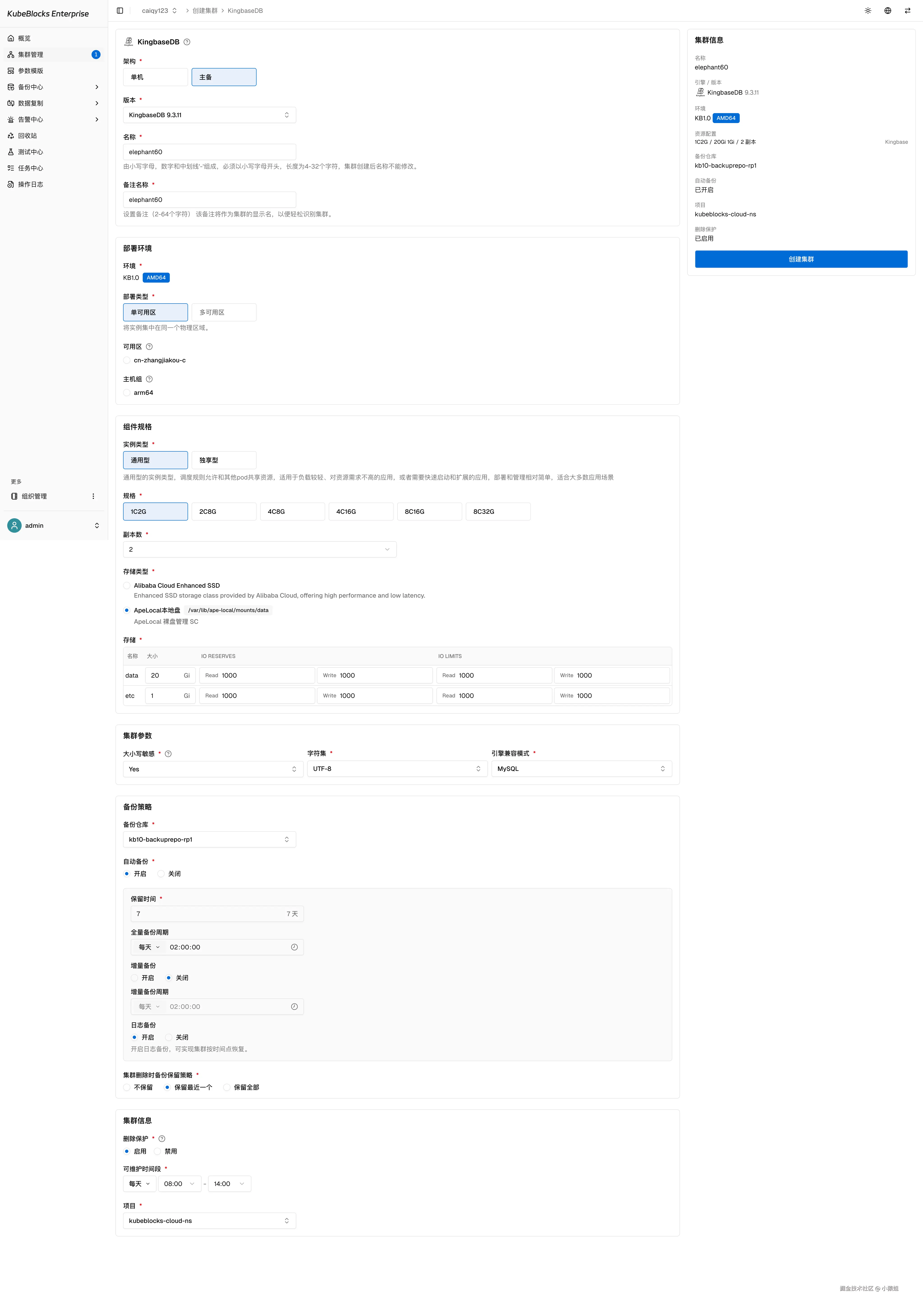 基于这套抽象模型,我们为 Kingbase 实现了面向不同版本和运行特性的对象定义,覆盖了 Kingbase 8 与 Kingbase 9 两个版本分支,并统一抽象出集群拓扑、组件角色、账号体系、配置管理和服务暴露方式。这样一来,Kingbase 不再依赖人为拼装脚本和环境,而是能够以声明式方式完成集群创建、版本适配、账号初始化、网络暴露和配置挂载。进一步结合控制台的实例创建页面,用户可以通过统一界面完成架构选择、版本选择、部署环境、资源规格、存储配置、集群参数和备份策略等关键配置。原本需要 DBA 和平台工程师分别处理的安装与初始化动作,被收敛为一套标准化、可复用、可审核的创建流程。对于平台团队来说,这一步非常关键,因为它把"会部署 Kingbase"变成了"平台能交付 Kingbase"。