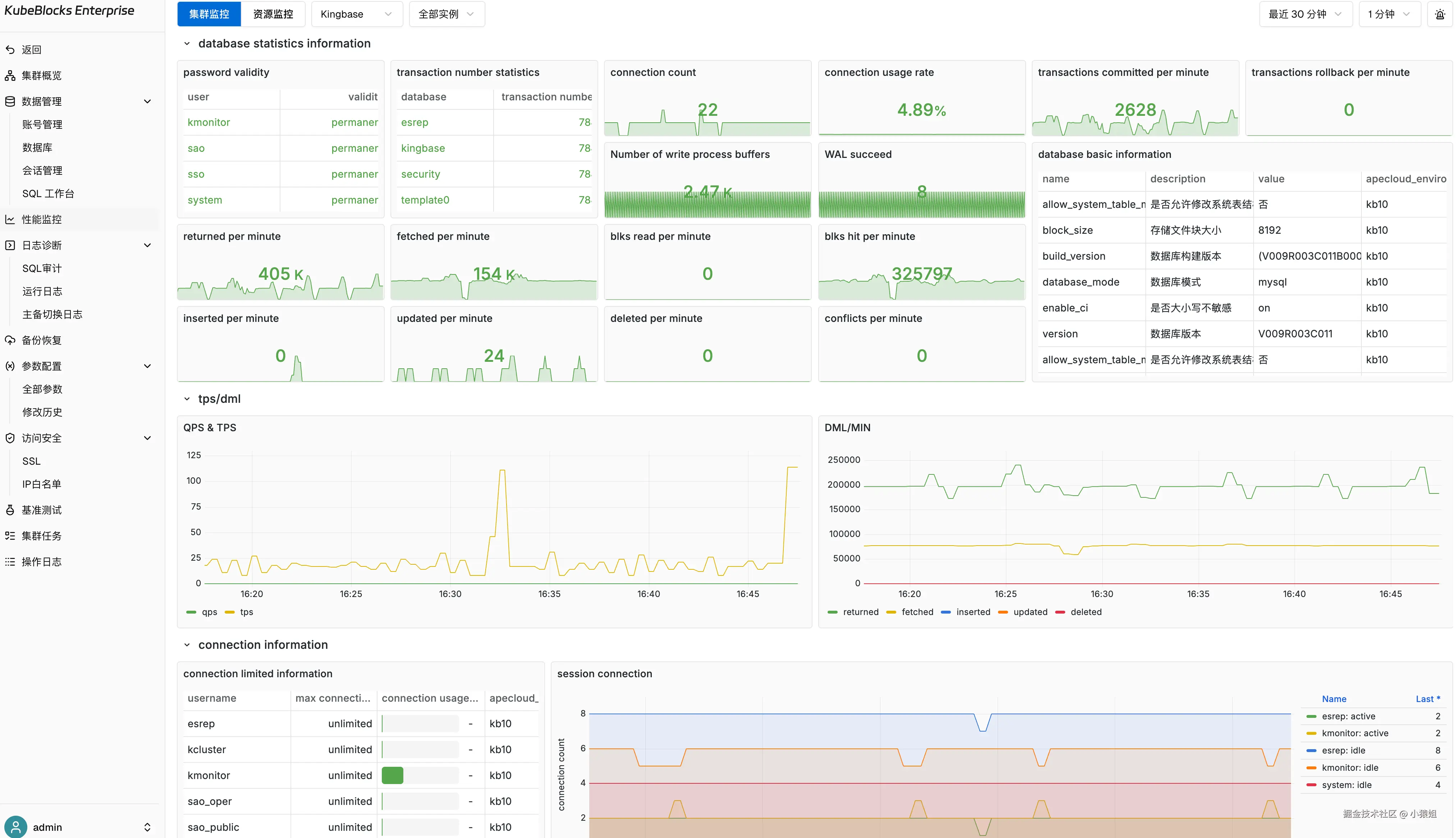 除了常见的高可用、备份、监控之外,KubeBlocks 企业版把 Kingbase 的其他日常运维动作也统一纳入平台入口中,包括数据管理、账号管理、安全管理等等,这些往往都是数据库生产托管里最容易被忽略、但最消耗人力的部分。