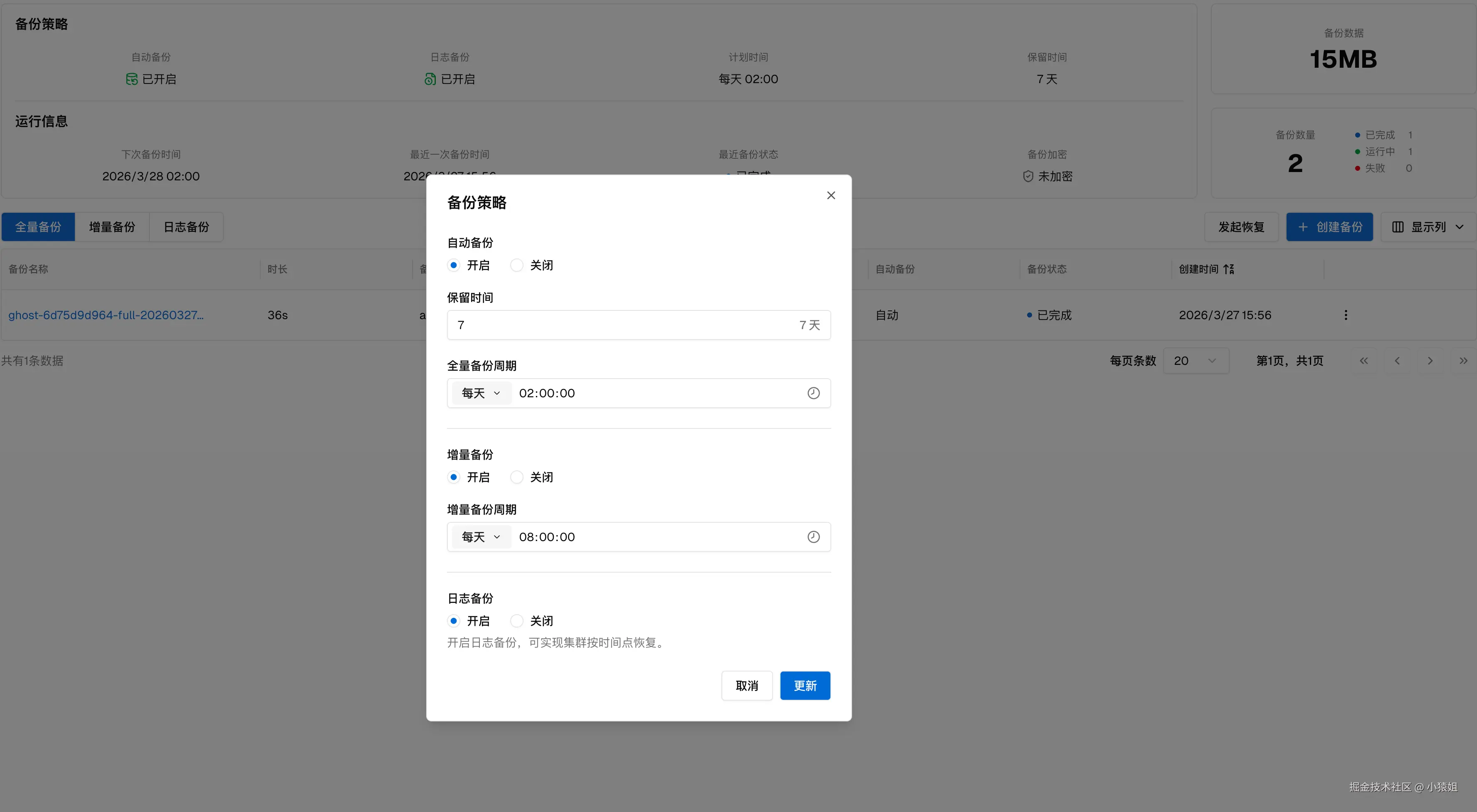 数据库真正进入核心生产后,备份恢复能力的重要性不亚于高可用。KubeBlocks For Kingbase 提供了完整的 BackupPolicyTemplate 与 ActionSet,支持全量备份、增量备份以及 PITR(Point-in-Time Recovery,时间点恢复)。这些能力并不是孤立存在,而是直接挂接在数据库组件生命周期中: