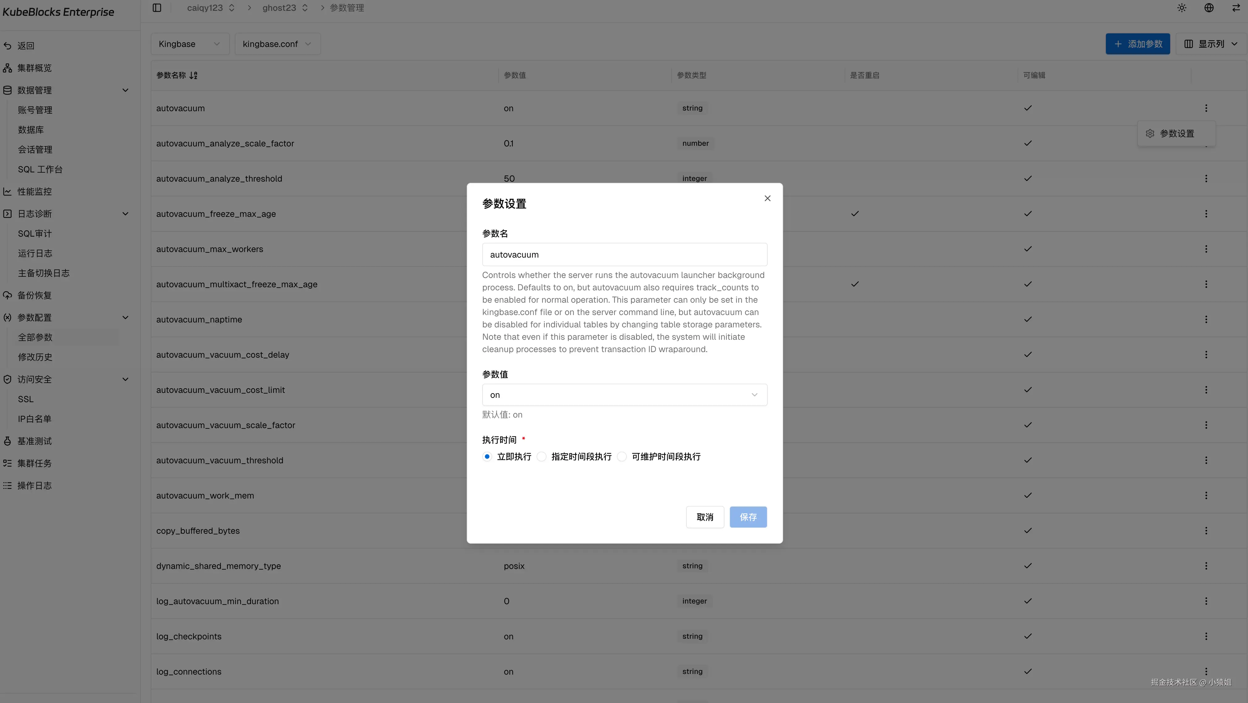 Kingbase 的云原生化并不止于部署和备份。在参数管理方面,KubeBlocks 为其提供了 ParametersDefinition,对静态参数、动态参数、不可变参数进行了分类定义,并支持参数变更后的 reload/restart 流程编排。参数变更通过声明式API方式下发,系统会根据参数类型和变更要求自动执行相应的操作来完成参数更新。所有的参数变更都可以通过平台进行统一管理和审计,避免了传统数据库中常见的"谁修改了参数"、"修改了什么参数"、"修改后系统状态如何"等不透明问题。