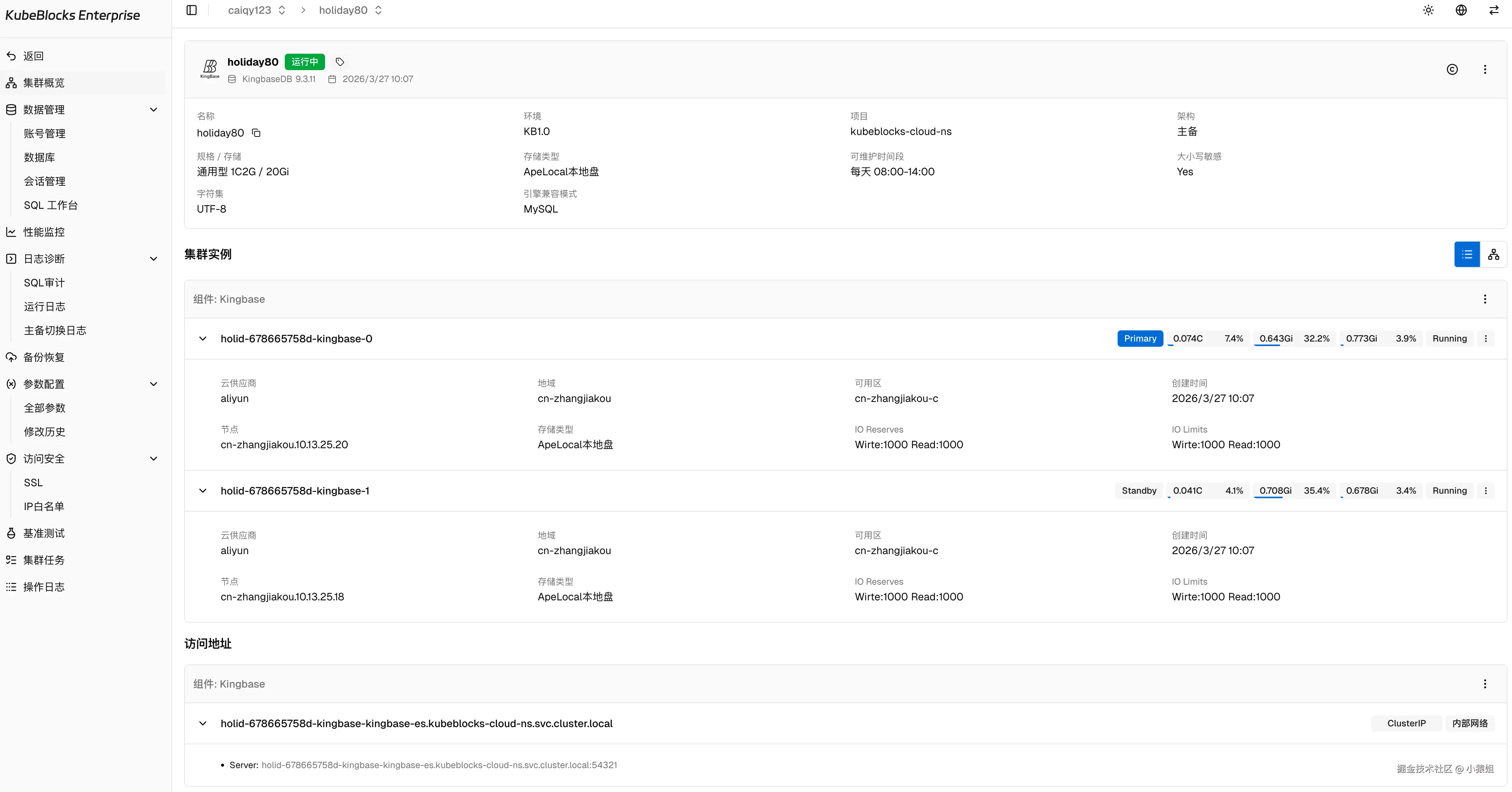 在这一过程中,声明式 API 是关键基础。KubeBlocks 通过声明式 API,将集群定义、生命周期管理、备份恢复、参数治理、监控审计和运维操作等能力统一抽象出来,让 Kingbase 能够以标准化、可编排的方式接入 Kubernetes 平台,并成为可被统一管理的数据库服务。