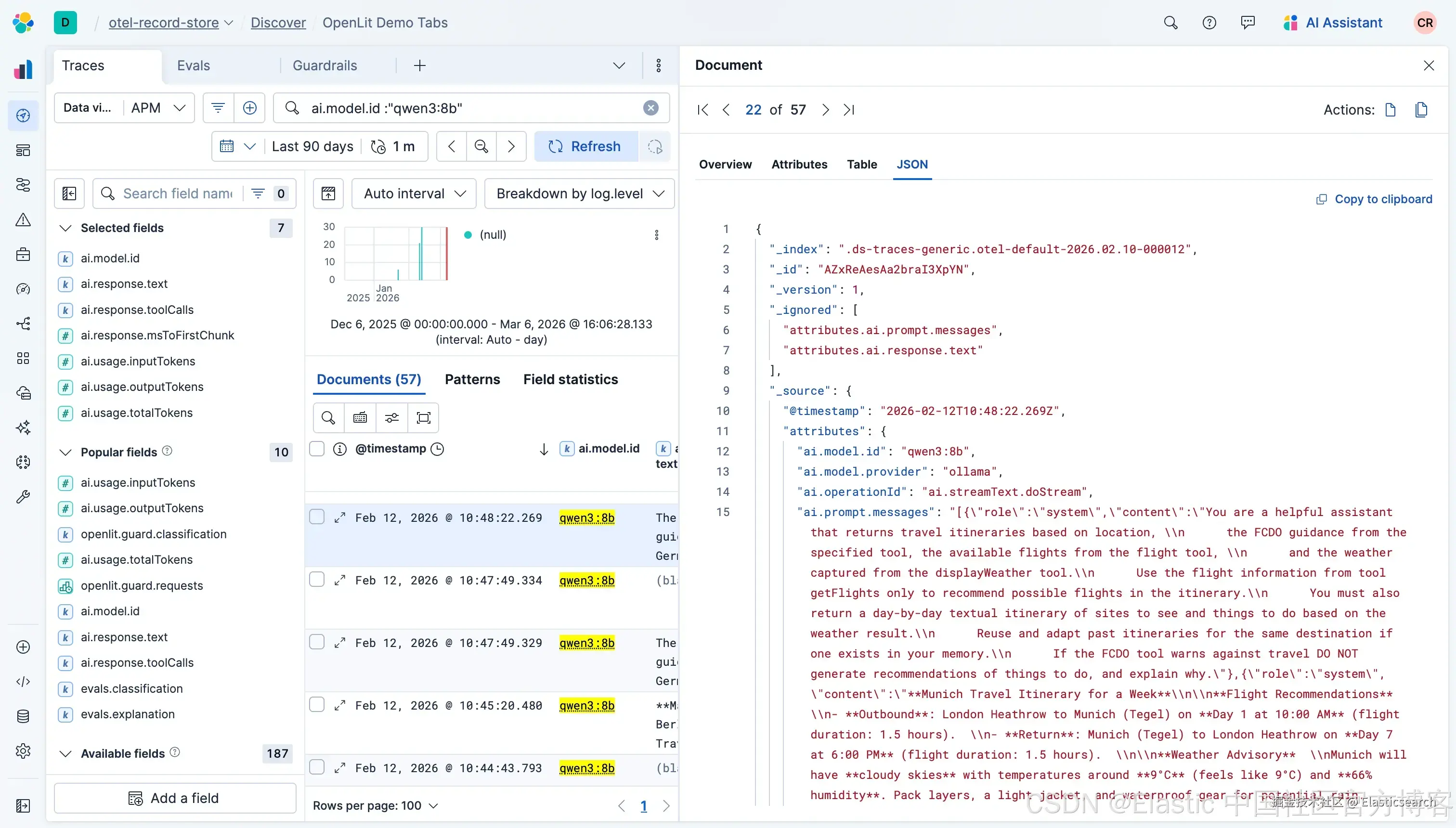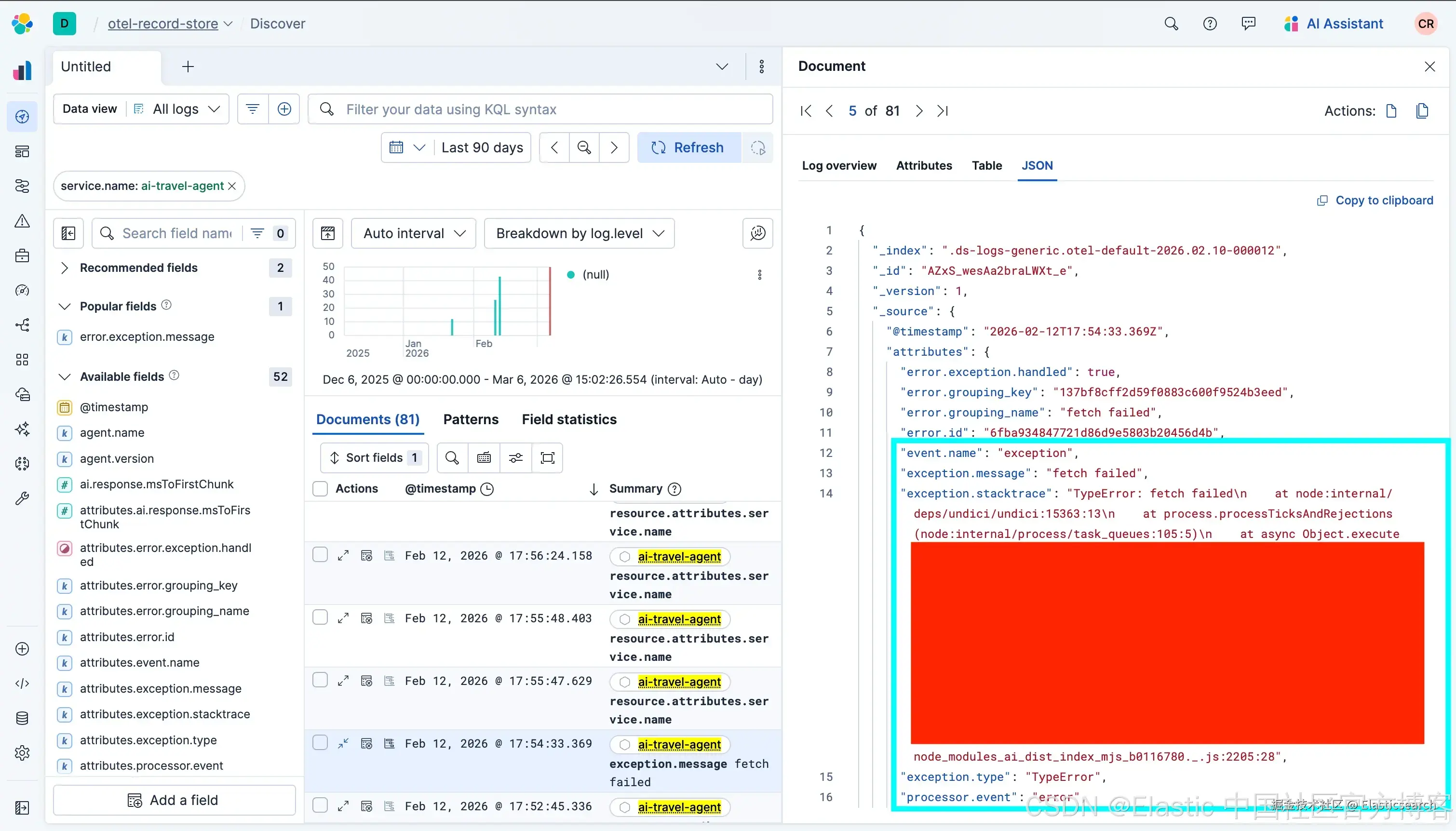 除了 prompts 之外,我们仍然需要全面的日志记录,特别是捕捉应用程序产生的完整堆栈 traces。这对于诊断来自底层基础设施或代码库的问题至关重要,而不仅仅是 AI 模型本身的问题。例如,下面发送到 Elastic 的错误显示了一个简单的 fetch 错误。我们不能忘记,传统错误在 AI 应用中仍然会发生,捕捉这些错误是至关重要的。