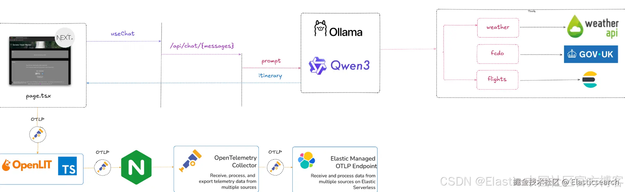 本指南解释了对 AI web agents 进行全栈监控的关键考虑因素,并通过使用 OpenLit、 OpenTelemetry 和 Elastic 的最佳实践和实际示例进行说明。具体来说,我们将涵盖监控一个位于该示例 repo 中的 web 旅行规划器示例。
