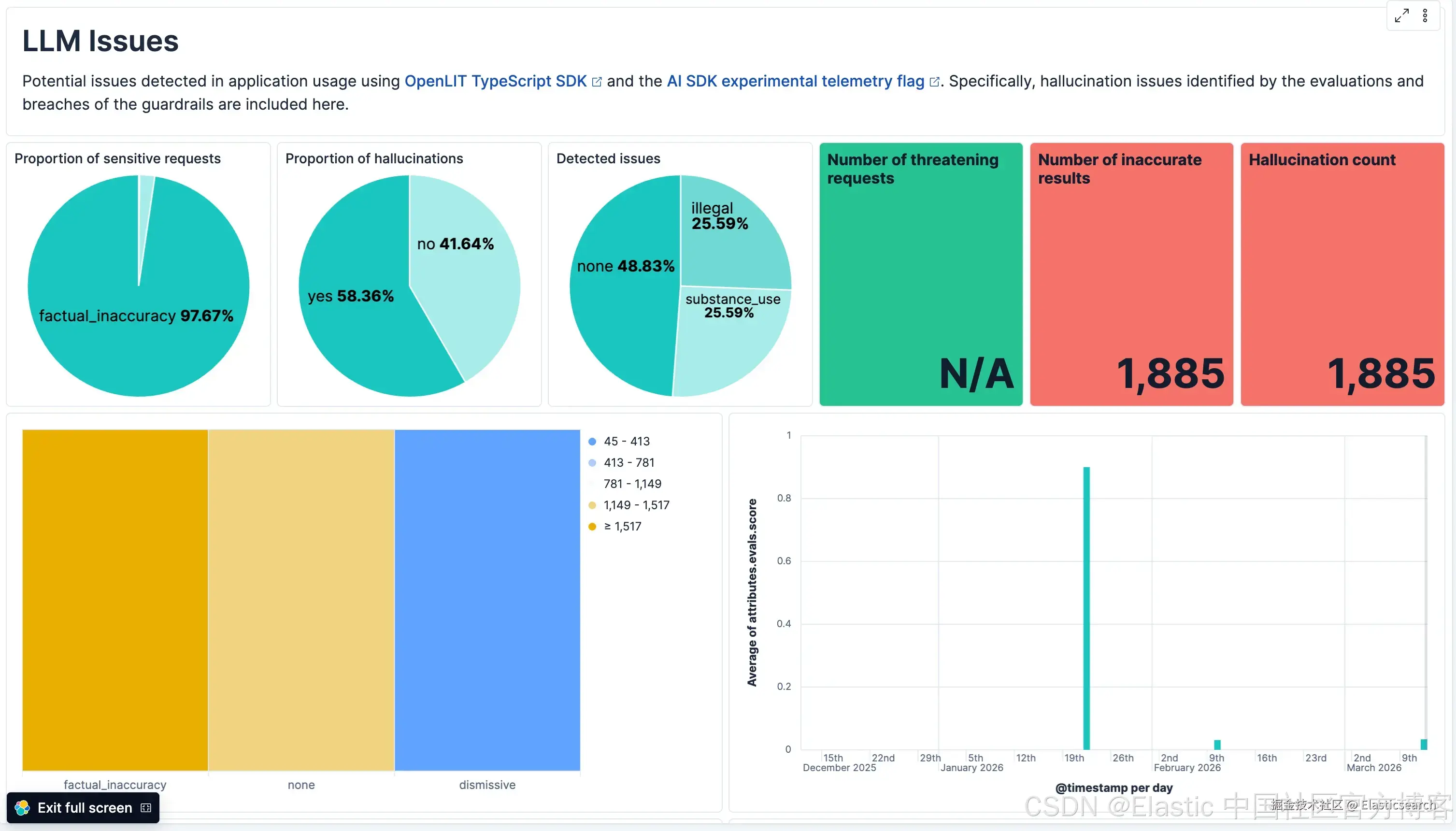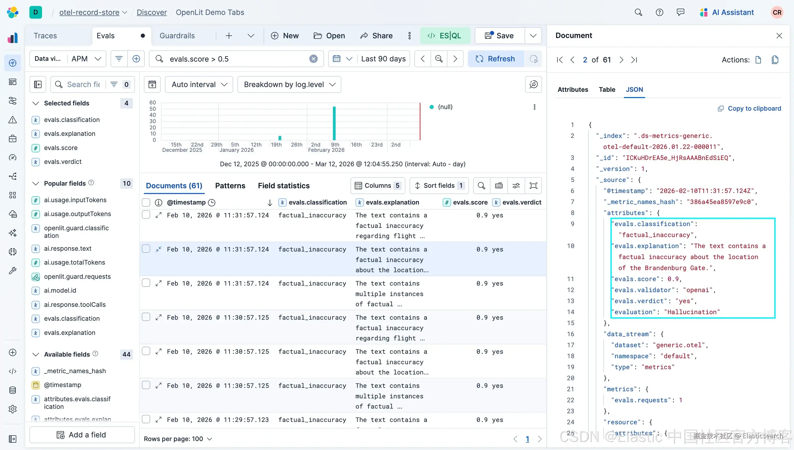 通过使用 collectMetrics 选项,evaluation 结果会自动作为 metrics 导出到 Elastic,使我们能够随时间监控 AI agent 输出的质量,并识别生产中可能出现的趋势或问题。evaluation 结果还可以用于触发告警或自动响应,例如当某些阈值或 SLOs 被触发时,如高评分持续数分钟、随着时间增加检测到的幻觉数量增加,或触发有害结果。