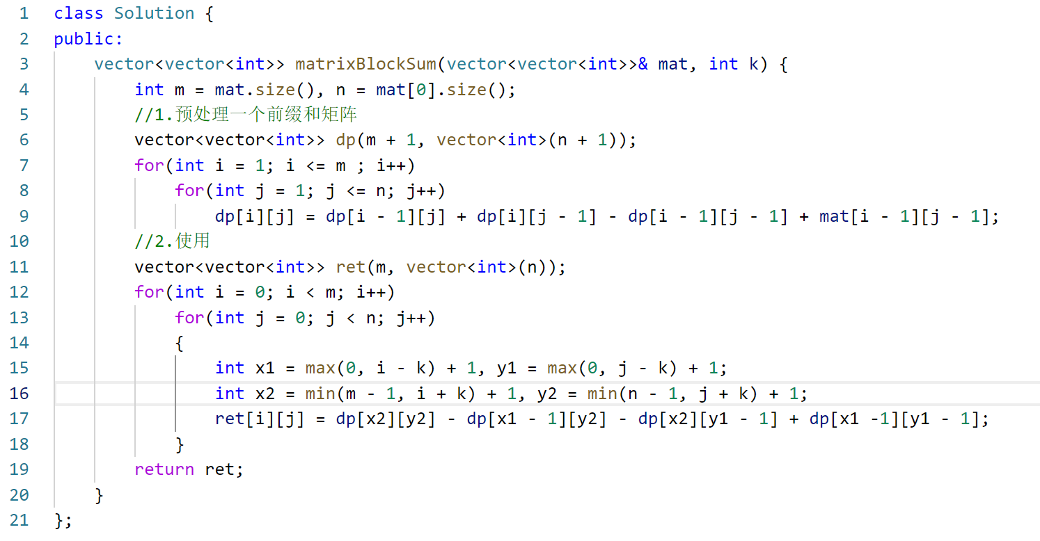 最终让我们返回一个同等规模的矩阵answer,answer任意一个位置的值是向上扩展k个单位,此时围成的长方形周围所有元素的和。比如求answer[0,0]: