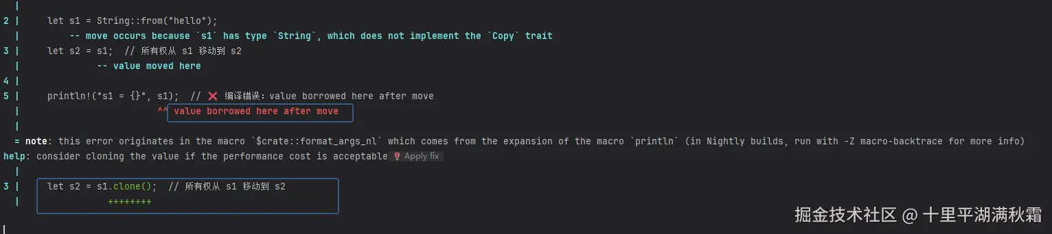 在上面代码中,创建 s1,它拥有 String 数据的所有权,然后s1 的所有权移动 给了 s2,最后又尝试使用已经失去所有权 的 s1