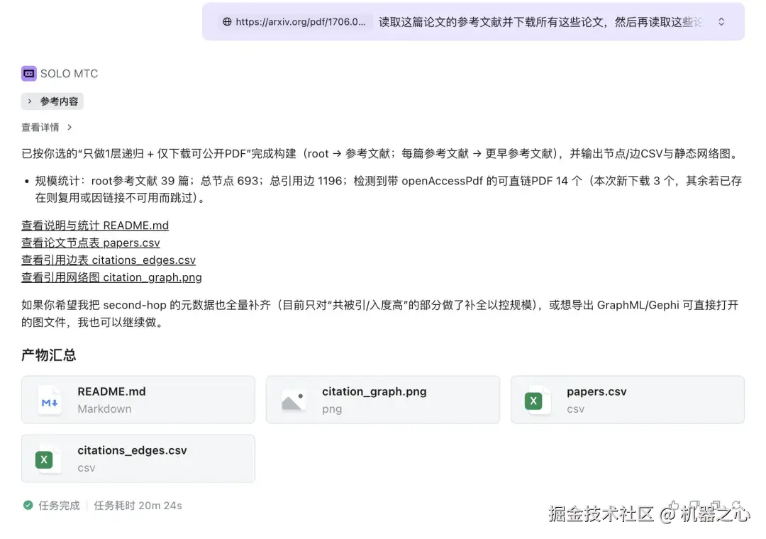 接下来,为了考验 SOLO 独立端的长上下文能力,我们决定来一个较为复杂的任务。我们向其提供了经典论文《Attention Is All You Need》的链接,然后让其读取这篇论文的参考文献并下载所有这些论文,然后再读取所有论文的参考文献,构建出所有这些论文之前的引用关系。