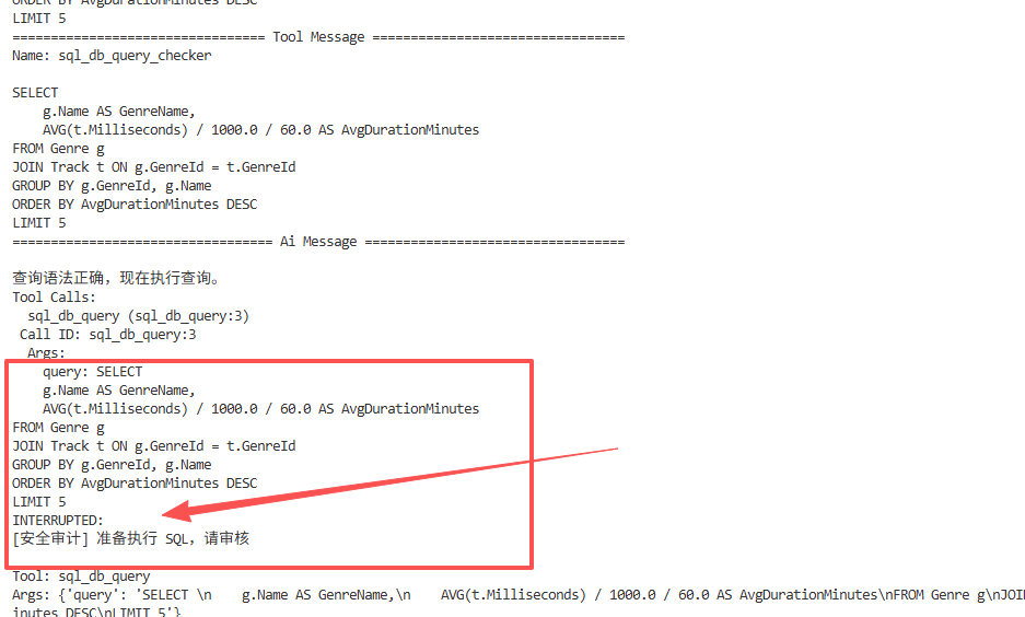 这意味着 Agent 在整个任务执行过程中,只有在伸手去碰数据库写权限/查询工具(即调用 sql_db_query)时,系统才会强行拉下闸门。