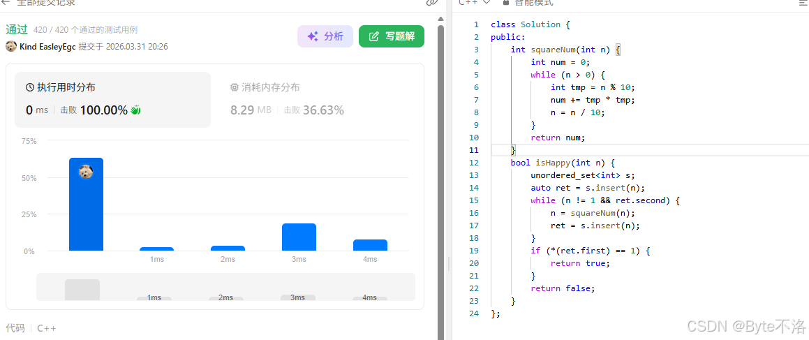 除了使用这种快慢指针的方式,我们还可以使用哈希集合的方式解决这道题,我们可以从开始就将正整数插入到集合中,这样反复检查新插入的数字是否已经在集合中,将这个作为我们跳出循环的判断,然后跳出循环之后,再次判断这个数是否为1,如果这个数为1,代表是快乐数,否则,代表这个数不是快乐数,并且哈希集合查询一个数是否在集合中的效率接近 O(1),速度也是杠杠的。