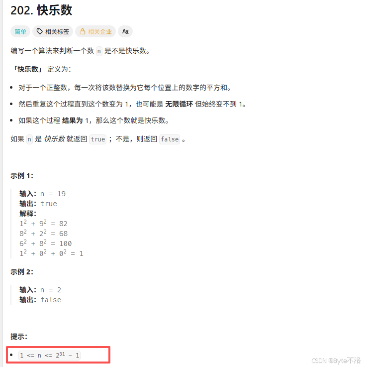 这里粗略的谈谈我的看法,我们可以看到题目中的正整数是int型的最大值,我们先通过计算器来看一看,结果是2 147 483 647,现在我们假设每一个位置都是9,也就是9 999 999 999,我们可以通过题目的要求计算一下这个数的结果是10个9*9,也就是810,也就意味着通过题目的要求转化之后,这个数的取值范围也就不过是1到810,这还是理想情况,即使恰好有那么一个数,刚好讲1到810这个区间的数字都取了一遍,下一次它的结果还会回到这个区间内,所以这道题不会存在一直平方下去的情况,他会陷入循环。