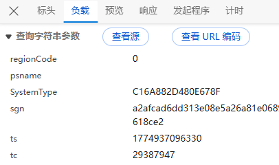 **负载:**对于GET请求:负载通常包含了传递的参数,有些网页负载可能为空,或者没有负载,因为所有参数都通过URL传递,这里我们可以看到时间戳(ts)与签名(sgn)等标签,没有进行加密;