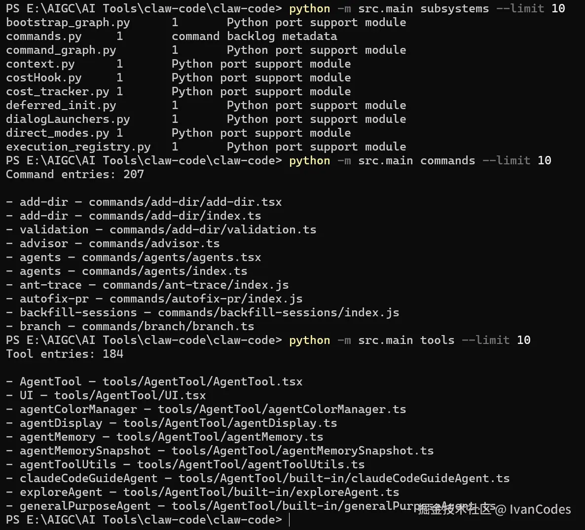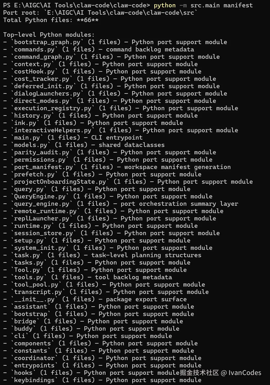 你如果去跑一下,会发现它现在更多是manifest、subsystems、commands、tools、 parity-audit