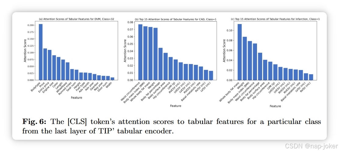 适用于不同图像编码器骨干:我们提议变换图像编码器骨干,以展示所提方法的普遍适用性。具体来说,我们使用了两种视觉变换器(ViT):ViT-S/16 和 ViT-B/16 [23],作为图像编码器的变体。由于ViT输出的是序列表示,我们直接将其投影到与表格表示相同的隐藏维度中。表3(a)示例说明,使用ViT的结果与使用ResNet-50相似,且大ViT-B表现并不优于较小的ViT-S。我们怀疑这是因为ViT在预训练后,在更大数据集上表现优于CNN,如[23]所示。 关键模型组件的消融研究:我们直接在监督下训练了TIP的模型架构,以评估SSL预训练策略的有效性。表3(b)和图5表明,我们的预训练策略能提升下游任务的性能,尤其是在缺失率较高且不完整数据时。此外,我们还进行了实验,去除了表格编码器中的列名嵌入或者微调过程中的集合学习。第3(b)条显示,扣除上述任何一项技术会导致性能下降。关于每个预训练任务及TIP表格编码器在补充品C.2-3条款中的额外消融研究。 掩蔽比的敏感性分析:我们研究不同掩蔽比ρ在MTR任务中的影响。表4显示,中等的掩蔽比ρ ∈(0.5, 0.7)能获得最佳性能,而过高(0.9)或过低(0.1)比值则不利于模型学习。更多分析见补充条款C.4。TIP表格特征注意力的可视化:在图6中,我们可视化了TIP在预测下游任务中特定类别时对不同表格特征的关注。为此,我们对测试集中同类样本的自注意力映射取平均,并给出[CLS]标记的注意力分数。我们观察到,TIP不仅关注与图像相关的特征,例如DVM中的颜色,还关注图像中不直接可见的特征,例如DVM中的价格。这凸显了整合多模态数据的重要性,因为它能在后续任务中提供额外的补充信息,而这些信息仅凭图像数据往往难以获得。关于交叉注意力和案例研究的更多可视化见补充文C.5。