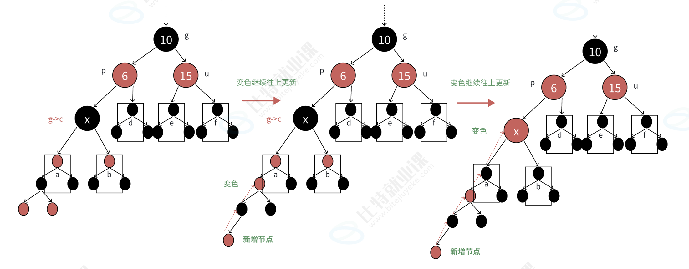 - [2.3.2c不是新增结点的抽象分析](#目录 @TOC 概要&序論 一,认识红黑树 1.1红黑树的概念 1.2红黑树的原则:四条规则交错编织出的平衡 Tips:关于“路径”的理解(高频易错点) Tips:红黑树如何确保最长路径不超过最短路径的2倍 1.3红黑树的效率:相当高效的查找算法 二,红黑树的插入 2.1总体结构搭建:红黑树与AVL树的结构有何不同 2.2红黑树插入一个值的大概过程 Tips:所有情况的总图 2.3情况一:u存在且为红——直接变色 2.3.1c是新增结点 2.3.2c不是新增结点的抽象分析 2.3.3c不是新增结点的具体分析 2.3.3.1情况一:hb == 0 2.3.3.2情况二:hb == 1 2.3.3.3情况二:hb==2 2.4情况二:u不存在或存在且为黑+直线结构——变色+单旋 2.4.1c是新增结点 Tips:不可能出现的情况 Tips.1:为什么u不存在的时候,c一定是新增结点? Tips.2:为什么u存在且为黑的时候,c一定不是新增结点? 2.4.2不是新增结点的情况 2.5情况三:u不存在或存在且为黑+折线结构——变色+双旋 2.5.1c是新插入结点 2.5.2c不是新插入结点 2.6红黑树插入的代码 三,红黑树的验证 3.1红黑树验证原理 3.2红黑树验证代码 四,红黑树完整代码)