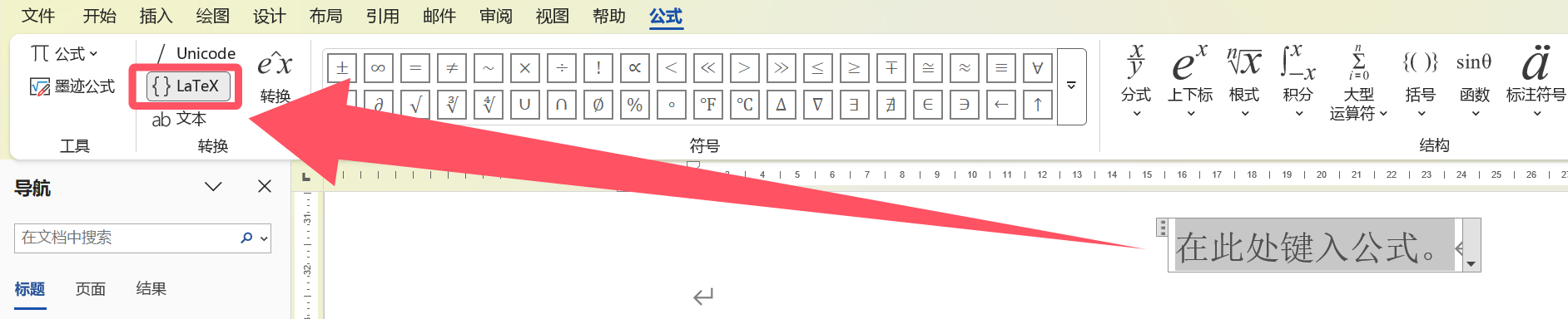 使用快捷键Alt +(Windows),直接调出公式框。然后,选择{}LaTex按钮。