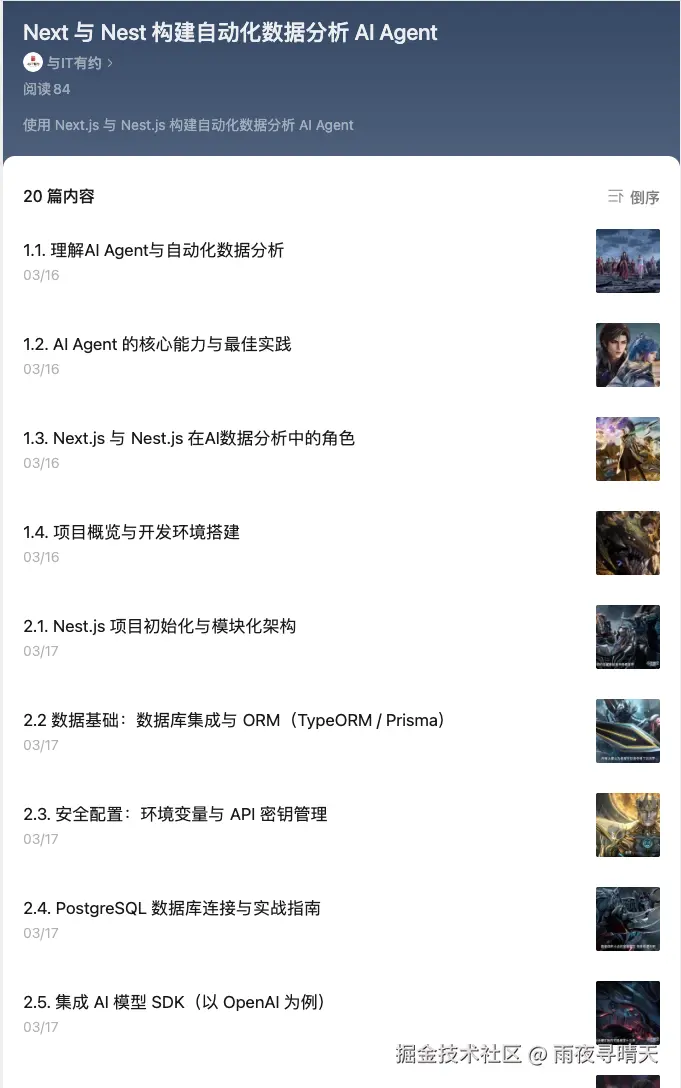 只看源码太枯燥?没关系!项目配套了 《使用 Next.js 与 Nest.js 构建自动化数据分析 AI Agent》 系列长文教程。从架构设计、环境搭建、大模型对接,到前端可视化仪表盘、异步队列实战,手把手带你打通全栈 AI 链路!