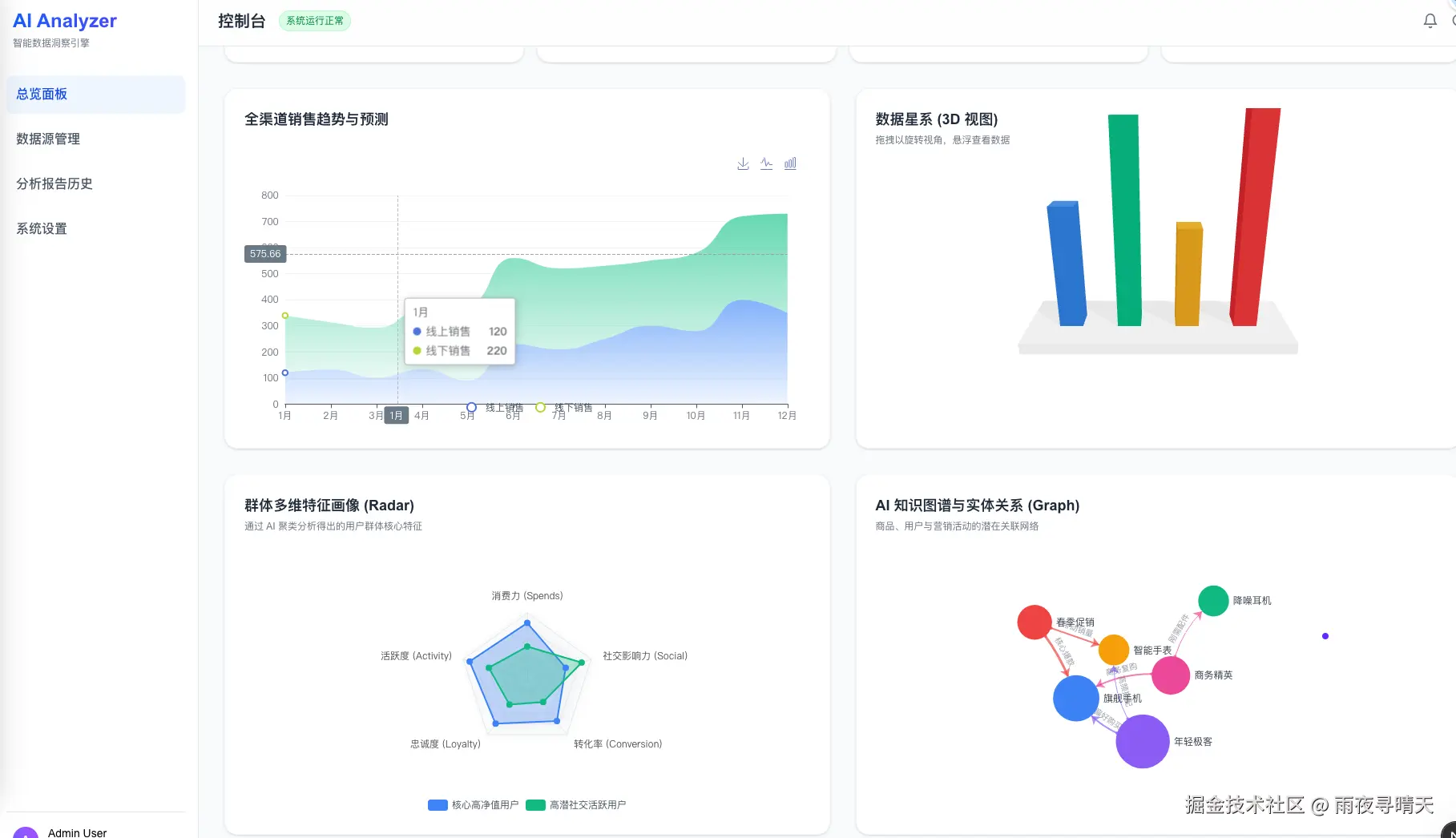 - 📊 酷炫的 2D/3D 进阶可视化:告别枯燥表格!集成 ECharts 和 Three.js (React Three Fiber),实现多维数据雷达图、AI 关系力导向图谱,甚至 3D 数据星系交互!